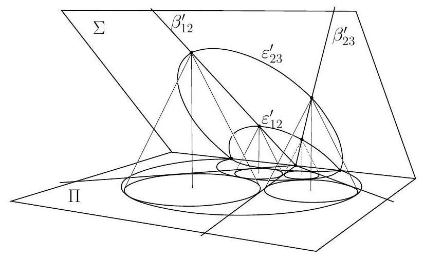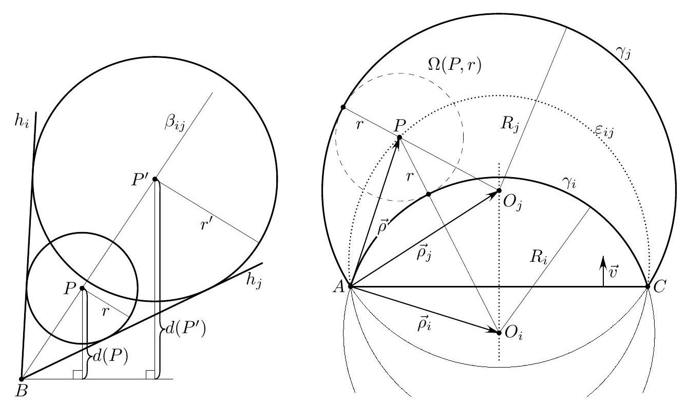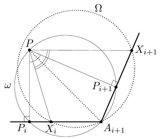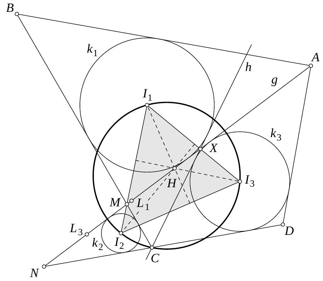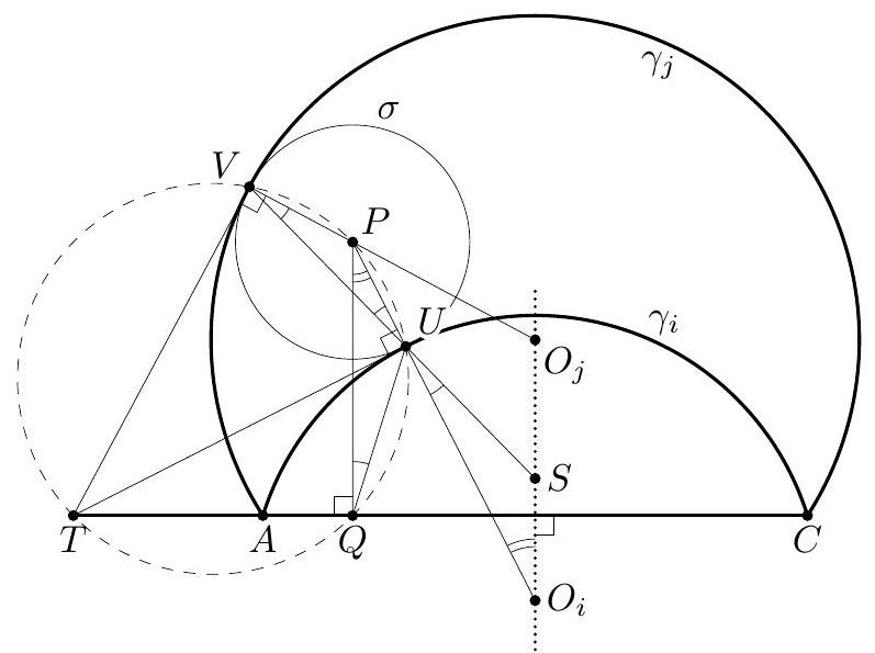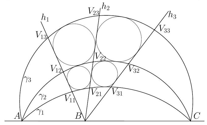 Denote by $O_{i}$ and $R_{i}$ the center and the radius of $\gamma_{i}$, respectively. Denote also by $H$ the half-plane defined by $A C$ which contains the whole configuration. For every point $P$ in the half-plane $H$, denote by $d(P)$ the distance between $P$ and line $A C$. Furthermore, for any $r>0$, denote by $\Omega(P, r)$ the circle with center $P$ and radius $r$. Lemma 1. For every $1 \leq i<j \leq 3$, consider those circles $\Omega(P, r)$ in the half-plane $H$ which are tangent to $h_{i}$ and $h_{j}$. (a) The locus of the centers of these circles is the angle bisector $\beta_{i j}$ between $h_{i}$ and $h_{j}$. (b) There is a constant $u_{i j}$ such that $r=u_{i j} \cdot d(P)$ for all such circles. Proof. Part (a) is obvious. To prove part (b), notice that the circles which are tangent to $h_{i}$ and $h_{j}$ are homothetic with the common homothety center $B$ (see Fig. 2). Then part (b) also becomes trivial. Lemma 2. For every $1 \leq i<j \leq 3$, consider those circles $\Omega(P, r)$ in the half-plane $H$ which are externally tangent to $\gamma_{i}$ and internally tangent to $\gamma_{j}$. (a) The locus of the centers of these circles is an ellipse $\operatorname{arc} \varepsilon_{i j}$ with end-points $A$ and $C$. (b) There is a constant $v_{i j}$ such that $r=v_{i j} \cdot d(P)$ for all such circles. Proof. (a) Notice that the circle $\Omega(P, r)$ is externally tangent to $\gamma_{i}$ and internally tangent to $\gamma_{j}$ if and only if $O_{i} P=R_{i}+r$ and $O_{j}=R_{j}-r$. Therefore, for each such circle we have $$ O_{i} P+O_{j} P=O_{i} A+O_{j} A=O_{i} C+O_{j} C=R_{i}+R_{j} $$ Such points lie on an ellipse with foci $O_{i}$ and $O_{j}$; the diameter of this ellipse is $R_{i}+R_{j}$, and it passes through the points $A$ and $C$. Let $\varepsilon_{i j}$ be that arc $A C$ of the ellipse which runs inside the half plane $H$ (see Fig. 3.) This ellipse arc lies between the arcs $\gamma_{i}$ and $\gamma_{j}$. Therefore, if some point $P$ lies on $\varepsilon_{i j}$, then $O_{i} P>R_{i}$ and $O_{j} P<R_{j}$. Now, we choose $r=O_{i} P-R_{i}=R_{j}-O_{j} P>0$; then the  circle $\Omega(P, r)$ touches $\gamma_{i}$ externally and touches $\gamma_{j}$ internally, so $P$ belongs to the locus under investigation. (b) Let $\vec{\rho}=\overrightarrow{A P}, \vec{\rho}_{i}=\overrightarrow{A O_{i}}$, and $\vec{\rho}_{j}=\overrightarrow{A O_{j}}$; let $d_{i j}=O_{i} O_{j}$, and let $\vec{v}$ be a unit vector orthogonal to $A C$ and directed toward $H$. Then we have $\left|\vec{\rho}_{i}\right|=R_{i},\left|\vec{\rho}_{j}\right|=R_{j},\left|\overrightarrow{O_{i} P}\right|=$ $\left|\vec{\rho}-\vec{\rho}_{i}\right|=R_{i}+r,\left|\overrightarrow{O_{j} P}\right|=\left|\vec{\rho}-\vec{\rho}_{j}\right|=R_{j}-r$, hence $$ \begin{gathered} \left(\vec{\rho}-\vec{\rho}_{i}\right)^{2}-\left(\vec{\rho}-\vec{\rho}_{j}\right)^{2}=\left(R_{i}+r\right)^{2}-\left(R_{j}-r\right)^{2}, \\ \left(\vec{\rho}_{i}^{2}-\vec{\rho}_{j}^{2}\right)+2 \vec{\rho} \cdot\left(\vec{\rho}_{j}-\vec{\rho}_{i}\right)=\left(R_{i}^{2}-R_{j}^{2}\right)+2 r\left(R_{i}+R_{j}\right), \\ d_{i j} \cdot d(P)=d_{i j} \vec{v} \cdot \vec{\rho}=\left(\vec{\rho}_{j}-\vec{\rho}_{i}\right) \cdot \vec{\rho}=r\left(R_{i}+R_{j}\right) . \end{gathered} $$ Therefore, $$ r=\frac{d_{i j}}{R_{i}+R_{j}} \cdot d(P) $$ and the value $v_{i j}=\frac{d_{i j}}{R_{i}+R_{j}}$ does not depend on $P$. Lemma 3. The curved quadrilateral $\mathcal{Q}_{i j}=\sqrt{i, j V_{i+1, j}} V_{i+1, j+1} V_{i, j+1}$ is circumscribed if and only if $u_{i, i+1}=v_{j, j+1}$. Proof. First suppose that the curved quadrilateral $\mathcal{Q}_{i j}$ is circumscribed and $\Omega(P, r)$ is its inscribed circle. By Lemma 1 and Lemma 2 we have $r=u_{i, i+1} \cdot d(P)$ and $r=v_{j, j+1} \cdot d(P)$ as well. Hence, $u_{i, i+1}=v_{j, j+1}$. To prove the opposite direction, suppose $u_{i, i+1}=v_{j, j+1}$. Let $P$ be the intersection of the angle bisector $\beta_{i, i+1}$ and the ellipse arc $\varepsilon_{j, j+1}$. Choose $r=u_{i, i+1} \cdot d(P)=v_{j, j+1} \cdot d(P)$. Then the circle $\Omega(P, r)$ is tangent to the half lines $h_{i}$ and $h_{i+1}$ by Lemma 1 , and it is tangent to the $\operatorname{arcs} \gamma_{j}$ and $\gamma_{j+1}$ by Lemma 2. Hence, the curved quadrilateral $\mathcal{Q}_{i j}$ is circumscribed. By Lemma 3, the statement of the problem can be reformulated to an obvious fact: If the equalities $u_{12}=v_{12}, u_{12}=v_{23}$, and $u_{23}=v_{12}$ hold, then $u_{23}=v_{23}$ holds as well. Comment 1. Lemma 2(b) (together with the easy Lemma 1(b)) is the key tool in this solution. If one finds this fact, then the solution can be finished in many ways. That is, one can find a circle touching three of $h_{2}, h_{3}, \gamma_{2}$, and $\gamma_{3}$, and then prove that it is tangent to the fourth one in either synthetic or analytical way. Both approaches can be successful. Here we present some discussion about this key Lemma. 1. In the solution above we chose an analytic proof for Lemma 2(b) because we expect that most students will use coordinates or vectors to examine the locus of the centers, and these approaches are less case-sensitive. Here we outline a synthetic proof. We consider only the case when $P$ does not lie in the line $O_{i} O_{j}$. The other case can be obtained as a limit case, or computed in a direct way. Let $S$ be the internal homothety center between the circles of $\gamma_{i}$ and $\gamma_{j}$, lying on $O_{i} O_{j}$; this point does not depend on $P$. Let $U$ and $V$ be the points of tangency of circle $\sigma=\Omega(P, r)$ with $\gamma_{i}$ and $\gamma_{j}$, respectively (then $r=P U=P V$ ); in other words, points $U$ and $V$ are the intersection points of rays $O_{i} P, O_{j} P$ with arcs $\gamma_{i}, \gamma_{j}$ respectively (see Fig. 4). Due to the theorem on three homothety centers (or just to the Menelaus theorem applied to triangle $O_{i} O_{j} P$ ), the points $U, V$ and $S$ are collinear. Let $T$ be the intersection point of line $A C$ and the common tang