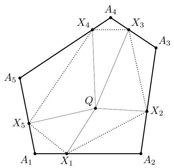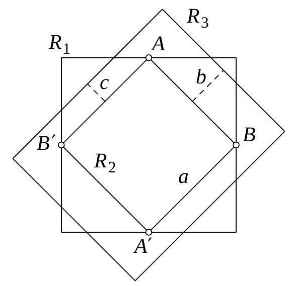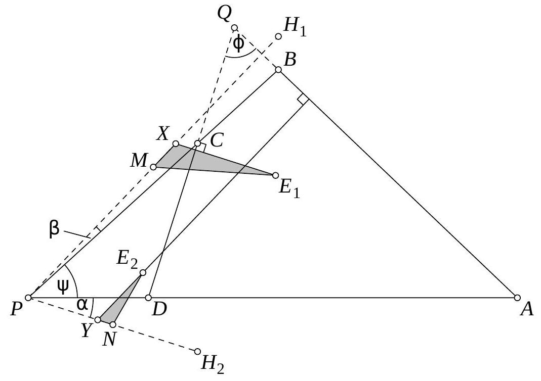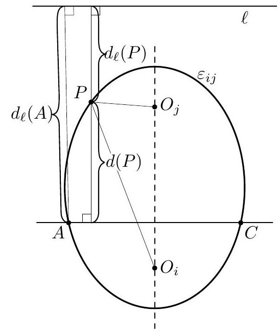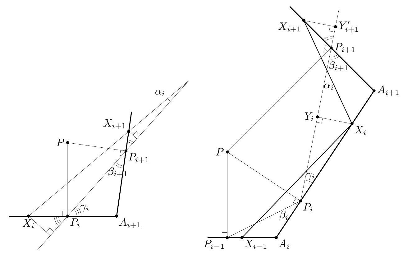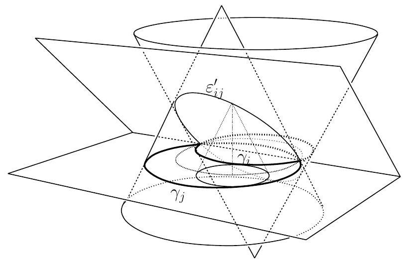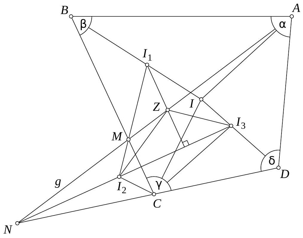 Denote by $O_{i}$ and $R_{i}$ the center and the radius of $\gamma_{i}$, respectively. Denote also by $H$ the half-plane defined by $A C$ which contains the whole configuration. For every point $P$ in the half-plane $H$, denote by $d(P)$ the distance between $P$ and line $A C$. Furthermore, for any $r>0$, denote by $\Omega(P, r)$ the circle with center $P$ and radius $r$. Lemma 1. For every $1 \leq i<j \leq 3$, consider those circles $\Omega(P, r)$ in the half-plane $H$ which are tangent to $h_{i}$ and $h_{j}$. (a) The locus of the centers of these circles is the angle bisector $\beta_{i j}$ between $h_{i}$ and $h_{j}$. (b) There is a constant $u_{i j}$ such that $r=u_{i j} \cdot d(P)$ for all such circles. Proof. Part (a) is obvious. To prove part (b), notice that the circles which are tangent to $h_{i}$ and $h_{j}$ are homothetic with the common homothety center $B$ (see Fig. 2). Then part (b) also becomes trivial. Lemma 2. For every $1 \leq i<j \leq 3$, consider those circles $\Omega(P, r)$ in the half-plane $H$ which are externally tangent to $\gamma_{i}$ and internally tangent to $\gamma_{j}$. (a) The locus of the centers of these circles is an ellipse $\operatorname{arc} \varepsilon_{i j}$ with end-points $A$ and $C$. (b) There is a constant $v_{i j}$ such that $r=v_{i j} \cdot d(P)$ for all such circles. Proof. (a) Notice that the circle $\Omega(P, r)$ is externally tangent to $\gamma_{i}$ and internally tangent to $\gamma_{j}$ if and only if $O_{i} P=R_{i}+r$ and $O_{j}=R_{j}-r$. Therefore, for each such circle we have $$ O_{i} P+O_{j} P=O_{i} A+O_{j} A=O_{i} C+O_{j} C=R_{i}+R_{j} $$ Such points lie on an ellipse with foci $O_{i}$ and $O_{j}$; the diameter of this ellipse is $R_{i}+R_{j}$, and it passes through the points $A$ and $C$. Let $\varepsilon_{i j}$ be that arc $A C$ of the ellipse which runs inside the half plane $H$ (see Fig. 3.) This ellipse arc lies between the arcs $\gamma_{i}$ and $\gamma_{j}$. Therefore, if some point $P$ lies on $\varepsilon_{i j}$, then $O_{i} P>R_{i}$ and $O_{j} P<R_{j}$. Now, we choose $r=O_{i} P-R_{i}=R_{j}-O_{j} P>0$; then the  circle $\Omega(P, r)$ touches $\gamma_{i}$ externally and touches $\gamma_{j}$ internally, so $P$ belongs to the locus under investigation. (b) Let $\vec{\rho}=\overrightarrow{A P}, \vec{\rho}_{i}=\overrightarrow{A O_{i}}$, and $\vec{\rho}_{j}=\overrightarrow{A O_{j}}$; let $d_{i j}=O_{i} O_{j}$, and let $\vec{v}$ be a unit vector orthogonal to $A C$ and directed toward $H$. Then we have $\left|\vec{\rho}_{i}\right|=R_{i},\left|\vec{\rho}_{j}\right|=R_{j},\left|\overrightarrow{O_{i} P}\right|=$ $\left|\vec{\rho}-\vec{\rho}_{i}\right|=R_{i}+r,\left|\overrightarrow{O_{j} P}\right|=\left|\vec{\rho}-\vec{\rho}_{j}\right|=R_{j}-r$, hence $$ \begin{gathered} \left(\vec{\rho}-\vec{\rho}_{i}\right)^{2}-\left(\vec{\rho}-\vec{\rho}_{j}\right)^{2}=\left(R_{i}+r\right)^{2}-\left(R_{j}-r\right)^{2}, \\ \left(\vec{\rho}_{i}^{2}-\vec{\rho}_{j}^{2}\right)+2 \vec{\rho} \cdot\left(\vec{\rho}_{j}-\vec{\rho}_{i}\right)=\left(R_{i}^{2}-R_{j}^{2}\right)+2 r\left(R_{i}+R_{j}\right), \\ d_{i j} \cdot d(P)=d_{i j} \vec{v} \cdot \vec{\rho}=\left(\vec{\rho}_{j}-\vec{\rho}_{i}\right) \cdot \vec{\rho}=r\left(R_{i}+R_{j}\right) . \end{gathered} $$ Therefore, $$ r=\frac{d_{i j}}{R_{i}+R_{j}} \cdot d(P) $$ and the value $v_{i j}=\frac{d_{i j}}{R_{i}+R_{j}}$ does not depend on $P$. Lemma 3. The curved quadrilateral $\mathcal{Q}_{i j}=\sqrt{i, j V_{i+1, j}} V_{i+1, j+1} V_{i, j+1}$ is circumscribed if and only if $u_{i, i+1}=v_{j, j+1}$. Proof. First suppose that the curved quadrilateral $\mathcal{Q}_{i j}$ is circumscribed and $\Omega(P, r)$ is its inscribed circle. By Lemma 1 and Lemma 2 we have $r=u_{i, i+1} \cdot d(P)$ and $r=v_{j, j+1} \cdot d(P)$ as well. Hence, $u_{i, i+1}=v_{j, j+1}$. To prove the opposite direction, suppose $u_{i, i+1}=v_{j, j+1}$. Let $P$ be the intersection of the angle bisector $\beta_{i, i+1}$ and the ellipse arc $\varepsilon_{j, j+1}$. Choose $r=u_{i, i+1} \cdot d(P)=v_{j, j+1} \cdot d(P)$. Then the circle $\Omega(P, r)$ is tangent to the half lines $h_{i}$ and $h_{i+1}$ by Lemma 1 , and it is tangent to the $\operatorname{arcs} \gamma_{j}$ and $\gamma_{j+1}$ by Lemma 2. Hence, the curved quadrilateral $\mathcal{Q}_{i j}$ is circumscribed. By Lemma 3, the statement of the problem can be reformulated to an obvious fact: If the equalities $u_{12}=v_{12}, u_{12}=v_{23}$, and $u_{23}=v_{12}$ hold, then $u_{23}=v_{23}$ holds as well. Comment 1. Lemma 2(b) (together with the easy Lemma 1(b)) is the key tool in this solution. If one finds this fact, then the solution can be finished in many ways. That is, one can find a circle touching three of $h_{2}, h_{3}, \gamma_{2}$, and $\gamma_{3}$, and then prove that it is tangent to the fourth one in either synthetic or analytical way. Both approaches can be successful. Here we present some discussion about this key Lemma. 1. In the solution above we chose an analytic proof for Lemma 2(b) because we expect that most students will use coordinates or vectors to examine the locus of the centers, and these approaches are less case-sensitive. Here we outline a synthetic proof. We consider only the case when $P$ does not lie in the line $O_{i} O_{j}$. The other case can be obtained as a limit case, or computed in a direct way. Let $S$ be the internal homothety center between the circles of $\gamma_{i}$ and $\gamma_{j}$, lying on $O_{i} O_{j}$; this point does not depend on $P$. Let $U$ and $V$ be the points of tangency of circle $\sigma=\Omega(P, r)$ with $\gamma_{i}$ and $\gamma_{j}$, respectively (then $r=P U=P V$ ); in other words, points $U$ and $V$ are the intersection points of rays $O_{i} P, O_{j} P$ with arcs $\gamma_{i}, \gamma_{j}$ respectively (see Fig. 4). Due to the theorem on three homothety centers (or just to the Menelaus theorem applied to triangle $O_{i} O_{j} P$ ), the points $U, V$ and $S$ are collinear. Let $T$ be the intersection point of line $A C$ and the common tang