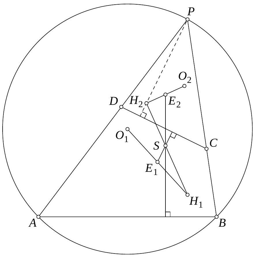 UNK Given a cyclic quadrilateral $A B C D$, let the diagonals $A C$ and $B D$ meet at $E$ and the lines $A D$ and $B C$ meet at $F$. The midpoints of $A B$ and $C D$ are $G$ and $H$, respectively. Show that $E F$ is tangent at $E$ to the circle through the points $E, G$, and $H$.