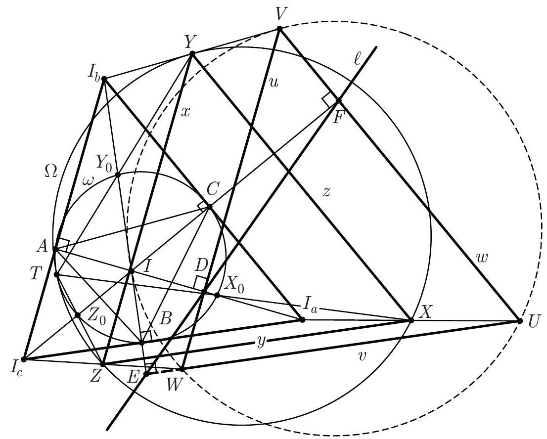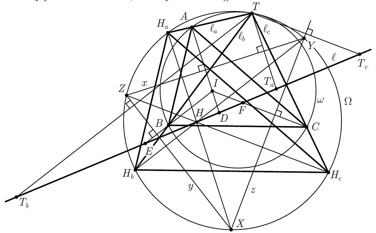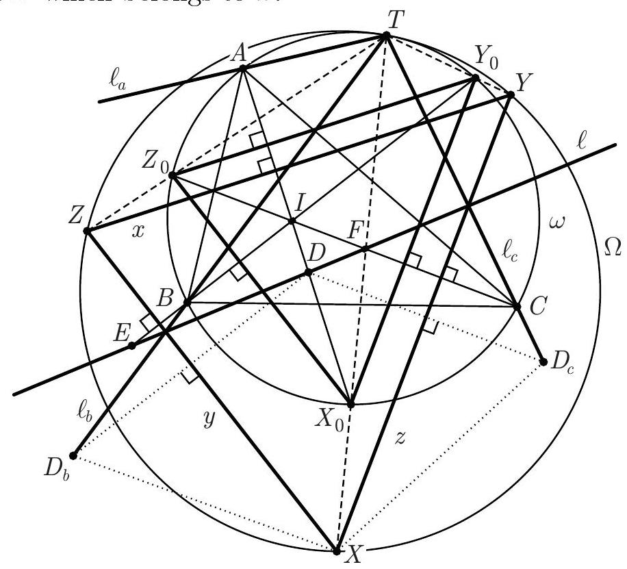 Claim 1. The reflections $\ell_{a}, \ell_{b}$ and $\ell_{c}$ of the line $\ell$ in the lines $x, y$, and $z$, respectively, are concurrent at a point $T$ which belongs to $\omega$.  Proof. Notice that $\Varangle\left(\ell_{b}, \ell_{c}\right)=\Varangle\left(\ell_{b}, \ell\right)+\Varangle\left(\ell, \ell_{c}\right)=2 \Varangle(y, \ell)+2 \Varangle(\ell, z)=2 \Varangle(y, z)$. But $y \perp B I$ and $z \perp C I$ implies $\Varangle(y, z)=\Varangle(B I, I C)$, so, since $2 \Varangle(B I, I C)=\Varangle(B A, A C)$, we obtain $$ \Varangle\left(\ell_{b}, \ell_{c}\right)=\Varangle(B A, A C) . $$ Since $A$ is the reflection of $D$ in $x$, $A$ belongs to $\ell_{a}$; similarly, $B$ belongs to $\ell_{b}$. Then (1) shows that the common point $T^{\prime}$ of $\ell_{a}$ and $\ell_{b}$ lies on $\omega$; similarly, the common point $T^{\prime \prime}$ of $\ell_{c}$ and $\ell_{b}$ lies on $\omega$. If $B \notin \ell_{a}$ and $B \notin \ell_{c}$, then $T^{\prime}$ and $T^{\prime \prime}$ are the second point of intersection of $\ell_{b}$ and $\omega$, hence they coincide. Otherwise, if, say, $B \in \ell_{c}$, then $\ell_{c}=B C$, so $\Varangle(B A, A C)=\Varangle\left(\ell_{b}, \ell_{c}\right)=\Varangle\left(\ell_{b}, B C\right)$, which shows that $\ell_{b}$ is tangent at $B$ to $\omega$ and $T^{\prime}=T^{\prime \prime}=B$. So $T^{\prime}$ and $T^{\prime \prime}$ coincide in all the cases, and the conclusion of the claim follows. Now we prove that $X, X_{0}, T$ are collinear. Denote by $D_{b}$ and $D_{c}$ the reflections of the point $D$ in the lines $y$ and $z$, respectively. Then $D_{b}$ lies on $\ell_{b}, D_{c}$ lies on $\ell_{c}$, and $$ \begin{aligned} \Varangle\left(D_{b} X, X D_{c}\right) & =\Varangle\left(D_{b} X, D X\right)+\Varangle\left(D X, X D_{c}\right)=2 \Varangle(y, D X)+2 \Varangle(D X, z)=2 \Varangle(y, z) \\ & =\Varangle(B A, A C)=\Varangle(B T, T C), \end{aligned} $$ hence the quadrilateral $X D_{b} T D_{c}$ is cyclic. Notice also that since $X D_{b}=X D=X D_{c}$, the points $D, D_{b}, D_{c}$ lie on a circle with centre $X$. Using in this circle the diameter $D_{c} D_{c}^{\prime}$ yields $\Varangle\left(D_{b} D_{c}, D_{c} X\right)=90^{\circ}+\Varangle\left(D_{b} D_{c}^{\prime}, D_{c}^{\prime} X\right)=90^{\circ}+\Varangle\left(D_{b} D, D D_{c}\right)$. Therefore, $$ \begin{gathered} \Varangle\left(\ell_{b}, X T\right)=\Varangle\left(D_{b} T, X T\right)=\Varangle\left(D_{b} D_{c}, D_{c} X\right)=90^{\circ}+\Varangle\left(D_{b} D, D D_{c}\right) \\ =90^{\circ}+\Varangle(B I, I C)=\Varangle(B A, A I)=\Varangle\left(B A, A X_{0}\right)=\Varangle\left(B T, T X_{0}\right)=\Varangle\left(\ell_{b}, X_{0} T\right) \end{gathered} $$ so the points $X, X_{0}, T$ are collinear. By a similar argument, $Y, Y_{0}, T$ and $Z, Z_{0}, T$ are collinear. As mentioned in the preamble, the statement of the problem follows. Comment 1. After proving Claim 1 one may proceed in another way. As it was shown, the reflections of $\ell$ in the sidelines of $X Y Z$ are concurrent at $T$. Thus $\ell$ is the Steiner line of $T$ with respect to $\triangle X Y Z$ (that is the line containing the reflections $T_{a}, T_{b}, T_{c}$ of $T$ in the sidelines of $X Y Z$ ). The properties of the Steiner line imply that $T$ lies on $\Omega$, and $\ell$ passes through the orthocentre $H$ of the triangle $X Y Z$.  Let $H_{a}, H_{b}$, and $H_{c}$ be the reflections of the point $H$ in the lines $x, y$, and $z$, respectively. Then the triangle $H_{a} H_{b} H_{c}$ is inscribed in $\Omega$ and homothetic to $A B C$ (by an easy angle chasing). Since $H_{a} \in \ell_{a}, H_{b} \in \ell_{b}$, and $H_{c} \in \ell_{c}$, the triangles $H_{a} H_{b} H_{c}$ and $A B C$ form a required pair of triangles $\Delta$ and $\delta$ mentioned in the preamble. Comment 2. The following observation shows how one may guess the description of the tangency point $T$ from Solution 1. Let us fix a direction and move the line $\ell$ parallel to this direction with constant speed. Then the points $D, E$, and $F$ are moving with constant speeds along the lines $A I, B I$, and $C I$, respectively. In this case $x, y$, and $z$ are moving with constant speeds, defining a family of homothetic triangles $X Y Z$ with a common centre of homothety $T$. Notice that the triangle $X_{0} Y_{0} Z_{0}$ belongs to this family (for $\ell$ passing through $I$ ). We may specify the location of $T$ considering the degenerate case when $x, y$, and $z$ are concurrent. In this degenerate case all the lines $x, y, z, \ell, \ell_{a}, \ell_{b}, \ell_{c}$ have a common point. Note that the lines $\ell_{a}, \ell_{b}, \ell_{c}$ remain constant as $\ell$ is moving (keeping its direction). Thus $T$ should be the common point of $\ell_{a}, \ell_{b}$, and $\ell_{c}$, lying on $\omega$.