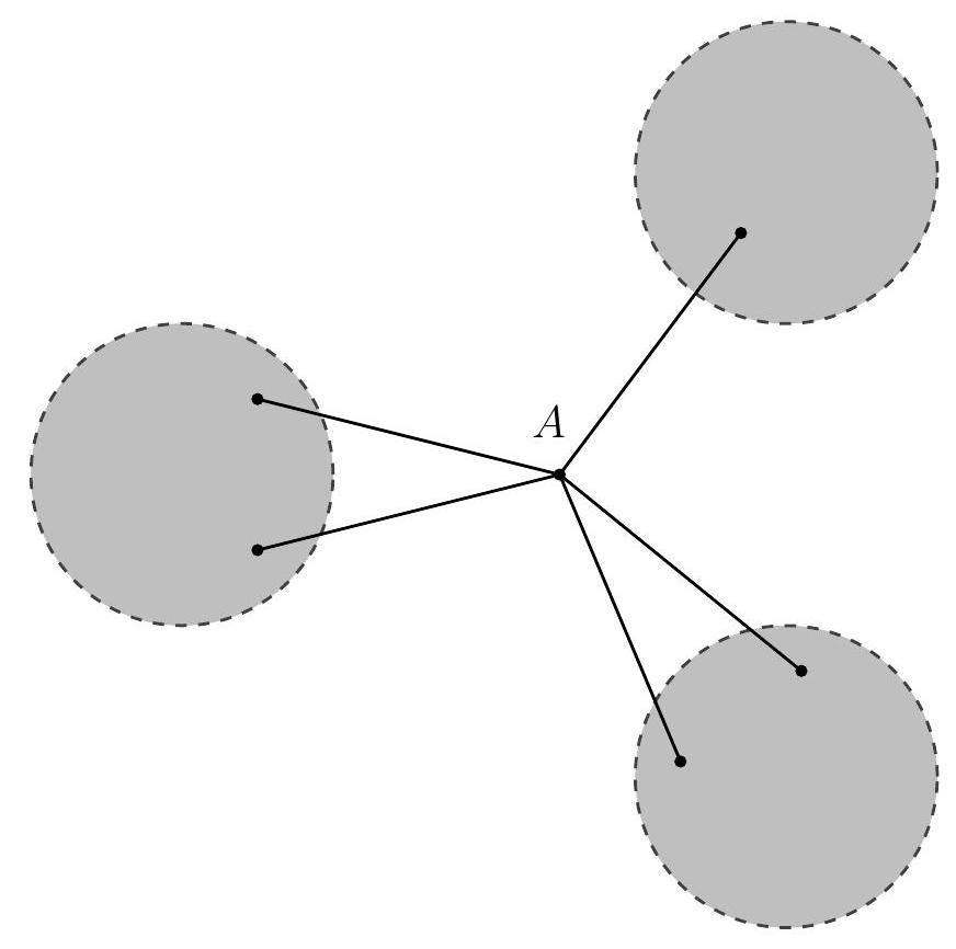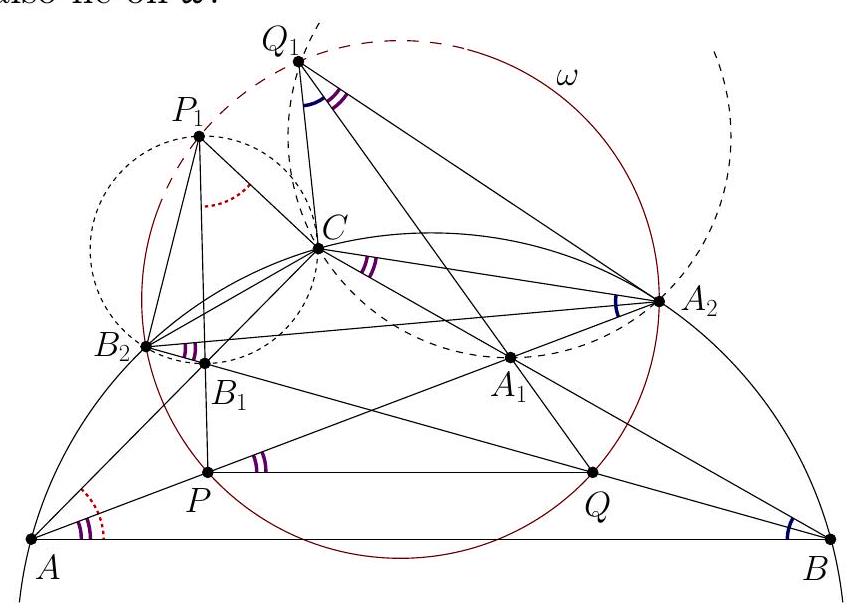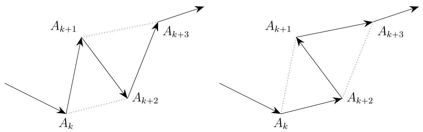 We shall think instead of the problem as asking us to assign a weight $\pm 1$ to each angle, such that the weighted sum of all the angles is zero. Given an ordering $A_{1}, \ldots, A_{2 n}$ of the points, we shall assign weights according to the following recipe: walk in order from point to point, and assign the left turns +1 and the right turns -1 . This is the same weighting as in Solution 3, and as in that solution, the weighted sum is a multiple of $360^{\circ}$. We now aim to show the following: Lemma. Transposing any two consecutive points in the ordering changes the weighted sum by $\pm 360^{\circ}$ or 0 . Knowing that, we can conclude quickly: if the ordering $A_{1}, \ldots, A_{2 n}$ has weighted angle sum $360 k^{\circ}$, then the ordering $A_{2 n}, \ldots, A_{1}$ has weighted angle sum $-360 k^{\circ}$ (since the angles are the same, but left turns and right turns are exchanged). We can reverse the ordering of $A_{1}$, $\ldots, A_{2 n}$ by a sequence of transpositions of consecutive points, and in doing so the weighted angle sum must become zero somewhere along the way. We now prove that lemma: Proof. Transposing two points amounts to taking a section $A_{k} A_{k+1} A_{k+2} A_{k+3}$ as depicted, reversing the central line segment $A_{k+1} A_{k+2}$, and replacing its two neighbours with the dotted lines.  Figure 1: Transposing two consecutive vertices: before (left) and afterwards (right) In each triangle, we alter the sum by $\pm 180^{\circ}$. Indeed, using (anticlockwise) directed angles modulo $360^{\circ}$, we either add or subtract all three angles of each triangle. Hence both triangles together alter the sum by $\pm 180 \pm 180^{\circ}$, which is $\pm 360^{\circ}$ or 0 .