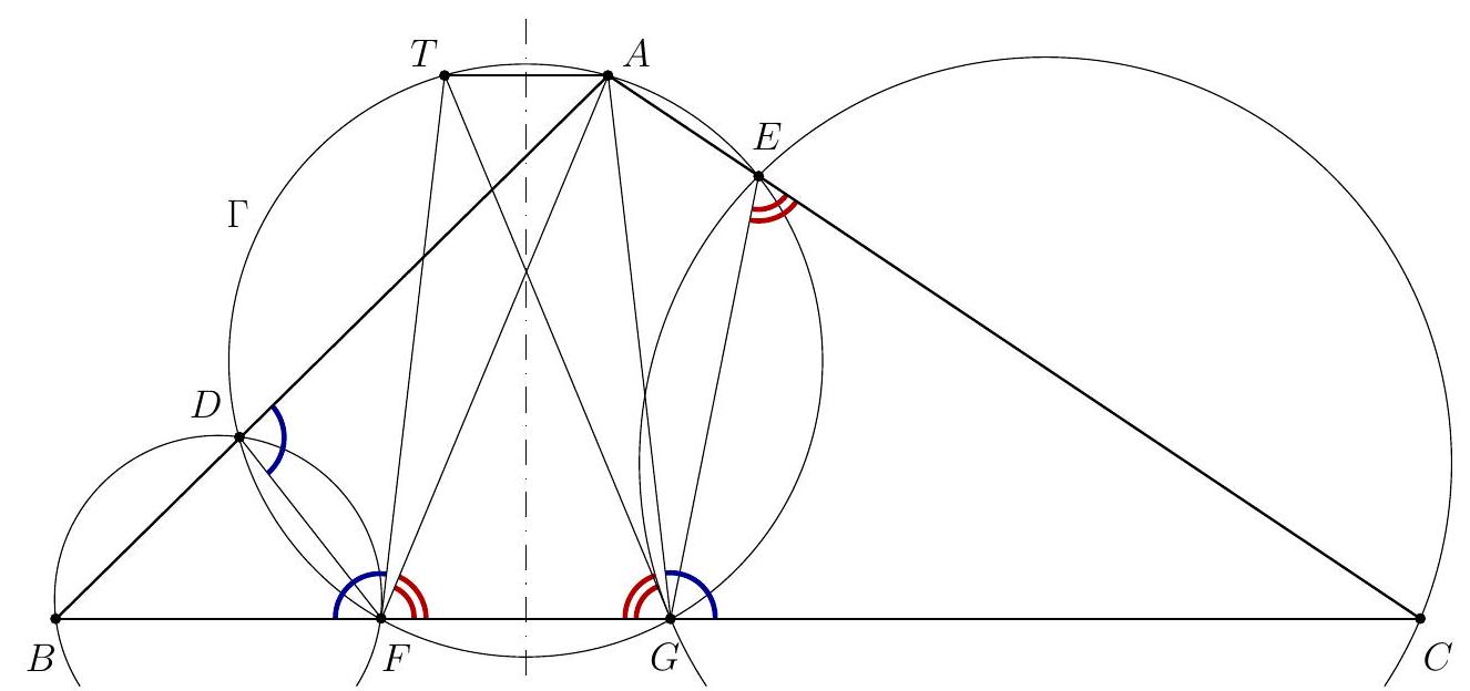 Notice that $\angle T F B=\angle F D A$ because $F T$ is tangent to circle $B D F$, and moreover $\angle F D A=\angle C G A$ because quadrilateral $A D F G$ is cyclic. Similarly, $\angle T G B=\angle G E C$ because $G T$ is tangent to circle $C E G$, and $\angle G E C=\angle C F A$. Hence, $$ \angle T F B=\angle C G A \text { and } \quad \angle T G B=\angle C F A $$  Triangles $F G A$ and $G F T$ have a common side $F G$, and by (1) their angles at $F, G$ are the same. So, these triangles are congruent. So, their altitudes starting from $A$ and $T$, respectively, are equal and hence $A T$ is parallel to line $B F G C$. Comment. Alternatively, we can prove first that $T$ lies on $\Gamma$. For example, this can be done by showing that $\angle A F T=\angle A G T$ using (1). Then the statement follows as $\angle T A F=\angle T G F=\angle G F A$.