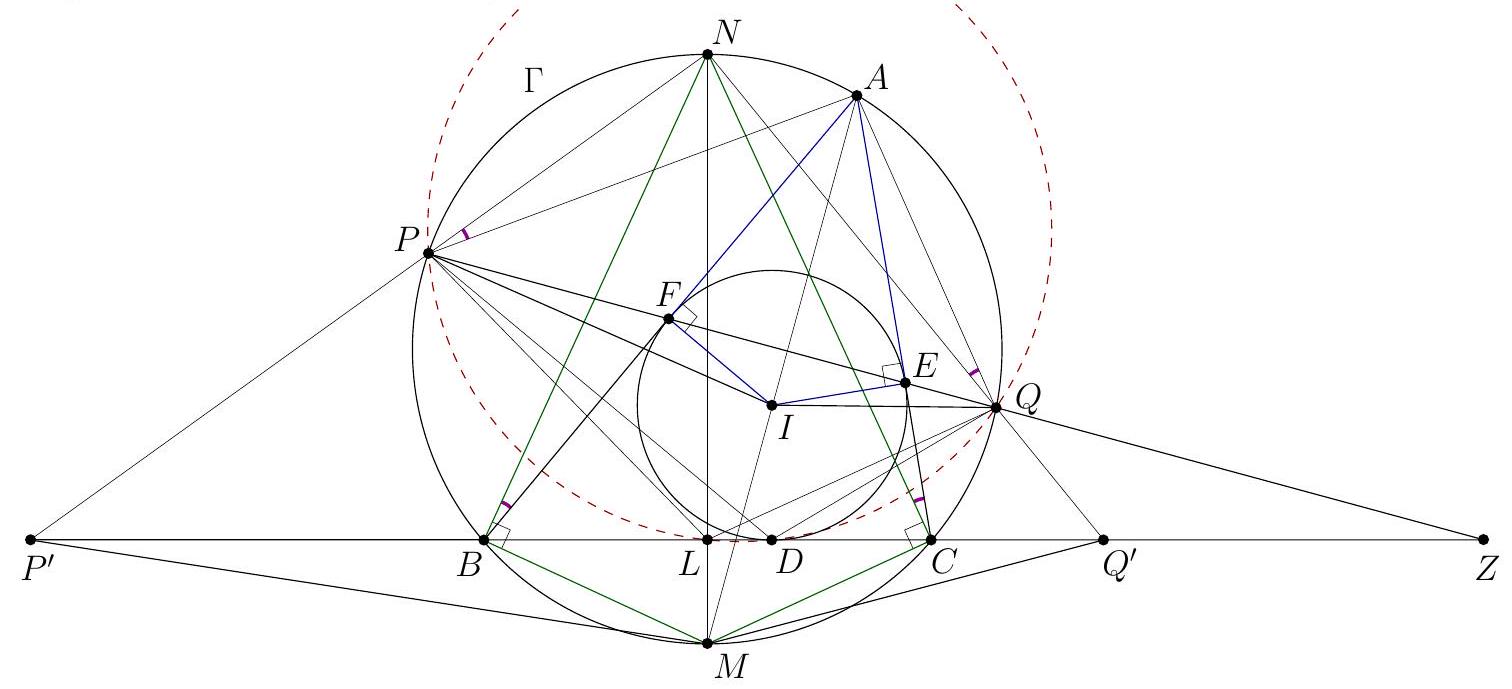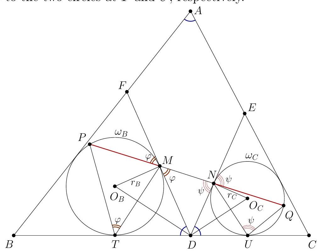 Denote the centres of $\omega_{B}$ and $\omega_{C}$ by $O_{B}$ and $O_{C}$, let their radii be $r_{B}$ and $r_{C}$, and let $B C$ be tangent to the two circles at $T$ and $U$, respectively.  From the cyclic quadrilaterals $A F D C$ and $A B D E$ we have $$ \angle M D O_{B}=\frac{1}{2} \angle F D B=\frac{1}{2} \angle B A C=\frac{1}{2} \angle C D E=\angle O_{C} D N, $$ so the right-angled triangles $D M O_{B}$ and $D N O_{C}$ are similar. The ratio of similarity between the two triangles is $$ \frac{D N}{D M}=\frac{O_{C} N}{O_{B} M}=\frac{r_{C}}{r_{B}} . $$ Let $\varphi=\angle D M N$ and $\psi=\angle M N D$. The lines $F M$ and $E N$ are tangent to $\omega_{B}$ and $\omega_{C}$, respectively, so $$ \angle M T P=\angle F M P=\angle D M N=\varphi \quad \text { and } \quad \angle Q U N=\angle Q N E=\angle M N D=\psi $$ (It is possible that $P$ or $Q$ coincides with $T$ or $U$, or lie inside triangles $D M T$ or $D U N$, respectively. To reduce case-sensitivity, we may use directed angles or simply ignore angles $M T P$ and $Q U N$.) In the circles $\omega_{B}$ and $\omega_{C}$ the lengths of chords $M P$ and $N Q$ are $$ M P=2 r_{B} \cdot \sin \angle M T P=2 r_{B} \cdot \sin \varphi \quad \text { and } \quad N Q=2 r_{C} \cdot \sin \angle Q U N=2 r_{C} \cdot \sin \psi $$ By applying the sine rule to triangle $D N M$ we get $$ \frac{D N}{D M}=\frac{\sin \angle D M N}{\sin \angle M N D}=\frac{\sin \varphi}{\sin \psi} $$ Finally, putting the above observations together, we get $$ \frac{M P}{N Q}=\frac{2 r_{B} \sin \varphi}{2 r_{C} \sin \psi}=\frac{r_{B}}{r_{C}} \cdot \frac{\sin \varphi}{\sin \psi}=\frac{D M}{D N} \cdot \frac{\sin \varphi}{\sin \psi}=\frac{\sin \psi}{\sin \varphi} \cdot \frac{\sin \varphi}{\sin \psi}=1, $$ so $M P=N Q$ as required.