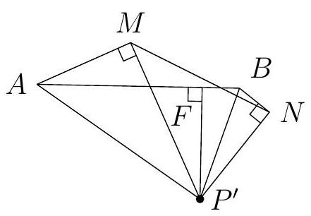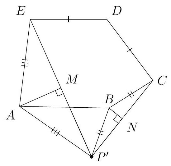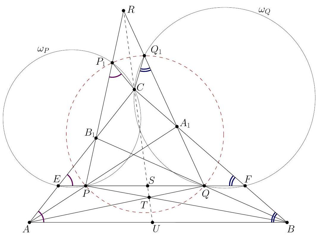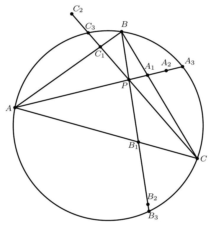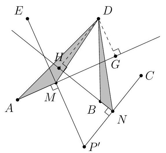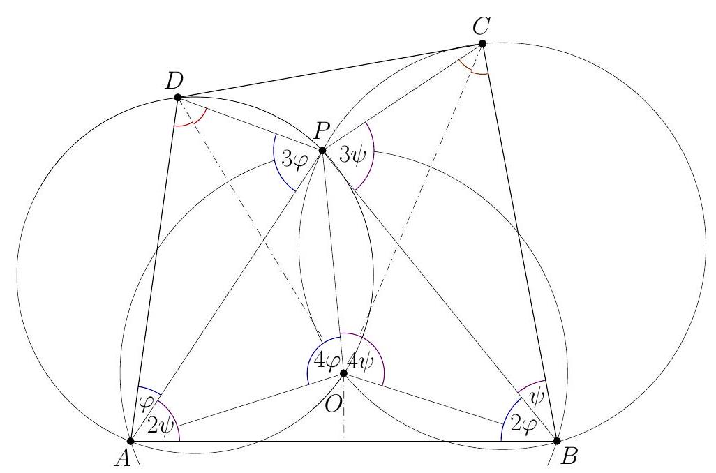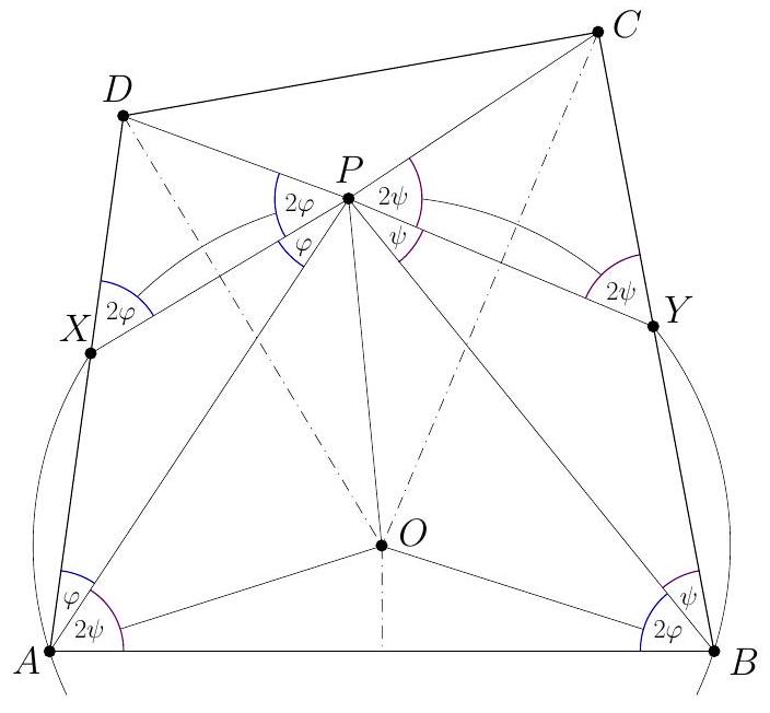 We define the angles $\varphi=\angle P A D, \psi=\angle C B P$ and use $\angle P B A=2 \varphi, \angle D P A=$ $3 \varphi, \angle B A P=2 \psi$ and $\angle B P C=3 \psi$ again. Let $O$ be the circumcenter of $\triangle A P B$. Notice that $\angle A D P=180^{\circ}-\angle P A D-\angle D P A=180^{\circ}-4 \varphi$, which, in particular, means that $4 \varphi<180^{\circ}$. Further, $\angle P O A=2 \angle P B A=4 \varphi=180^{\circ}-\angle A D P$, therefore the quadrilateral $A D P O$ is cyclic. By $A O=O P$, it follows that $\angle A D O=\angle O D P$. Thus $D O$ is the internal bisector of $\angle A D P$. Similarly, $C O$ is the internal bisector of $\angle P C B$.  Finally, $O$ lies on the perpendicular bisector of $A B$ as it is the circumcenter of $\triangle A P B$. Therefore the three given lines in the problem statement concur at point $O$.