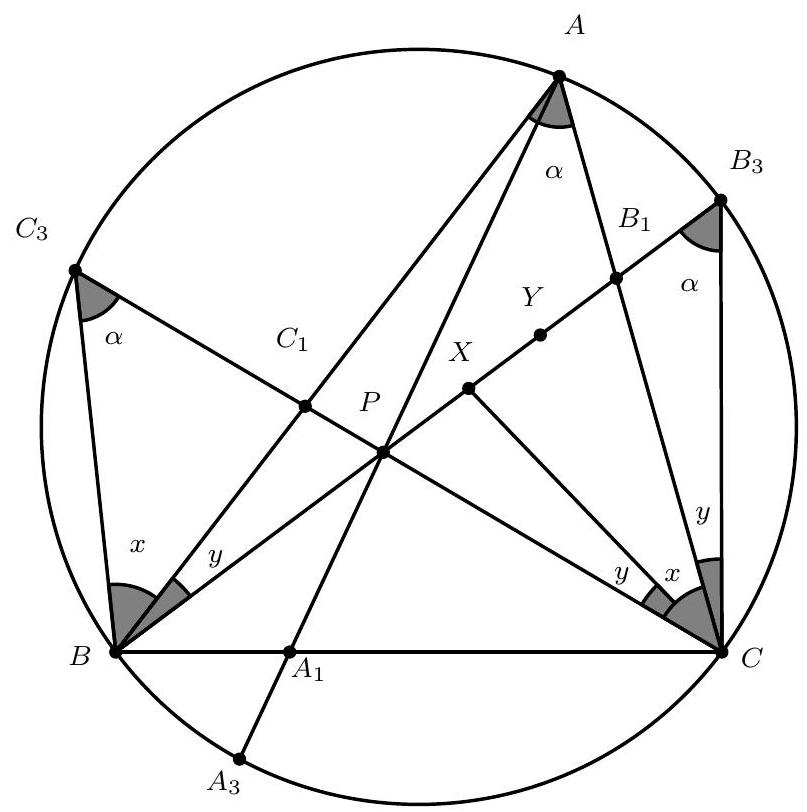 Perform an inversion centered at $I$; the images of the points are denoted by primes, e.g., $A^{\prime}$ is the image of $A$. On the inverted figure, $I$ and $\Gamma^{\prime}$ are the orthocenter and the circumcircle of triangle $A^{\prime} B^{\prime} C^{\prime}$, respectively. The points $P^{\prime}$ and $Q^{\prime}$ lie on $\Gamma^{\prime}$ such that $B^{\prime} P^{\prime} \| C^{\prime} Q^{\prime}$ (since $B^{\prime} P^{\prime}=\omega_{B}^{\prime}$ and $C^{\prime} Q^{\prime}=\omega_{C}^{\prime}$ ). The points $M^{\prime}$ and $N^{\prime}$ are the second intersections of lines $B^{\prime} P^{\prime}$ and $C^{\prime} Q^{\prime}$ with the circumcircles $\gamma_{B}$ and $\gamma_{C}$ of triangles $A^{\prime} I B^{\prime}$ and $A^{\prime} I C^{\prime}$, respectively. Notice here that $\gamma_{C}$ is obtained from $\gamma_{B}$ by the translation at $\overrightarrow{B^{\prime} C^{\prime}}$; the same translation maps line $B^{\prime} P^{\prime}$ to $C^{\prime} Q^{\prime}$, and hence $M^{\prime}$ to $N^{\prime}$. In other words, $B^{\prime} M^{\prime} N^{\prime} C^{\prime}$ is a parallelogram, and $P^{\prime} Q^{\prime}$ partitions it into two isosceles trapezoids. Point $X^{\prime}$ is the second intersection point of circles $\left(I P^{\prime} M^{\prime}\right)$ and $\left(I Q^{\prime} N^{\prime}\right)$ that is - the reflection of $I$ in their line of centers. But the centers lie on the common perpendicular bisector $p$ of $P^{\prime} M^{\prime}$ and $Q^{\prime} N^{\prime}$, so $p$ is that line of centers. Hence, $I X^{\prime} \| B^{\prime} P^{\prime}$, as both lines are perpendicular to $p$. Finally, the point $Y$ satisfies $\Varangle(B Y, B I)=\Varangle(P B, P I)$ and $\Varangle(C Y, C I)=\Varangle(Q C, Q I)$, which yields $\Varangle\left(Y^{\prime} B^{\prime}, Y^{\prime} I\right)=\Varangle\left(B^{\prime} P^{\prime}, B^{\prime} I\right)$ and $\Varangle\left(Y^{\prime} C^{\prime}, Y^{\prime} I\right)=\Varangle\left(C^{\prime} Q^{\prime}, C^{\prime} I\right)$. Therefore, $$ \Varangle\left(Y^{\prime} B^{\prime}, Y^{\prime} C^{\prime}\right)=\Varangle\left(B^{\prime} P^{\prime}, B^{\prime} I\right)+\Varangle\left(C^{\prime} I, C^{\prime} Q^{\prime}\right)=\Varangle\left(C^{\prime} I, B^{\prime} I\right)=\Varangle\left(A^{\prime} B^{\prime}, A^{\prime} C^{\prime}\right), $$ which shows that $Y^{\prime} \in \Gamma^{\prime}$. In congruent circles $\Gamma^{\prime}$ and $\gamma_{B}$, the chords $A^{\prime} P^{\prime}$ and $A^{\prime} M^{\prime}$ subtend the same angle $\angle A^{\prime} B^{\prime} P^{\prime}$; therefore, $A^{\prime} P^{\prime}=A^{\prime} M^{\prime}$, and hence $A^{\prime} \in p$. This yields $A^{\prime} X^{\prime}=A^{\prime} I$, and hence $\Varangle\left(I A^{\prime}, I X^{\prime}\right)=$ $\Varangle\left(X^{\prime} I, X^{\prime} A^{\prime}\right)$ 。 Finally, we have $$ \begin{aligned} \Varangle\left(Y^{\prime} I, Y^{\prime} A^{\prime}\right) & =\Varangle\left(Y^{\prime} I, Y^{\prime} B^{\prime}\right)+\Varangle\left(Y^{\prime} B^{\prime}, Y^{\prime} A^{\prime}\right) \\ & =\Varangle\left(B^{\prime} I, B^{\prime} P^{\prime}\right)+\Varangle\left(I A^{\prime}, I B^{\prime}\right)=\Varangle\left(I A^{\prime}, B^{\prime} P^{\prime}\right)=\Varangle\left(I A^{\prime}, I X^{\prime}\right)=\Varangle\left(X^{\prime} I, X^{\prime} A^{\prime}\right), \end{aligned} $$ which yields that the points $A^{\prime}, X^{\prime}, Y^{\prime}$, and $I$ are concyclic. This means exactly that $A, X$, and $Y$ are collinear.  Comment 2. An inversion at $I$ may also help in establishing Step 2 in Solution 1. Indeed, relation $A^{\prime} X^{\prime}=A^{\prime} I$ yields $X A=X I$, so that $X \in E F$. On the other hand, $I X^{\prime} \| B^{\prime} P^{\prime}$ yields $I X \| \ell$, i.e., $X \in \ell$.