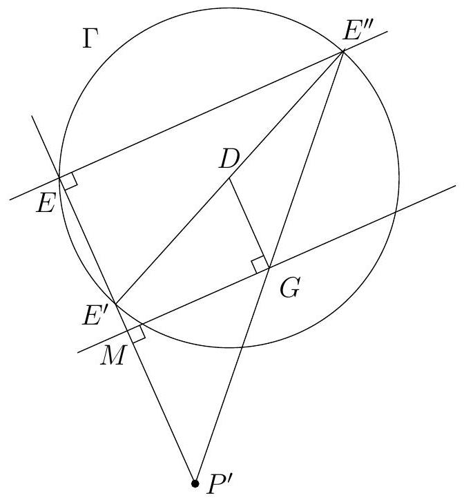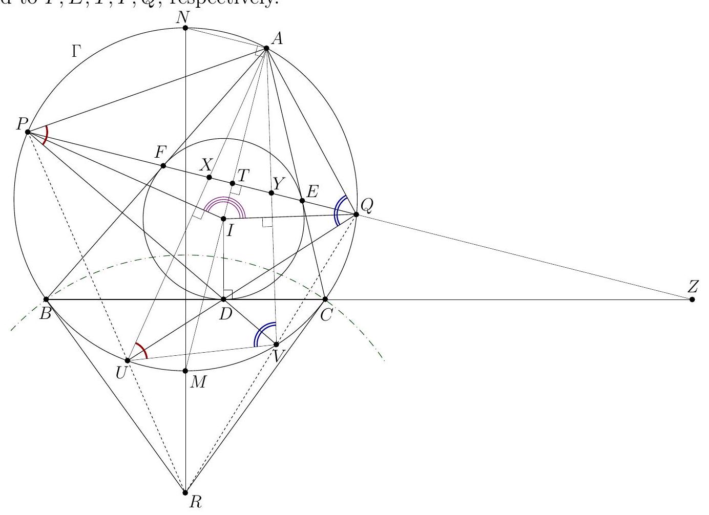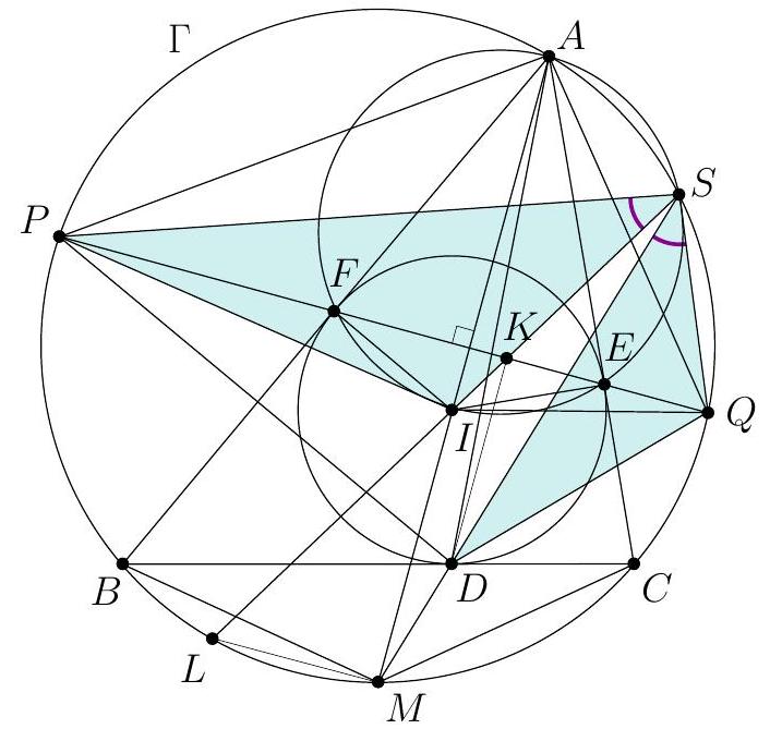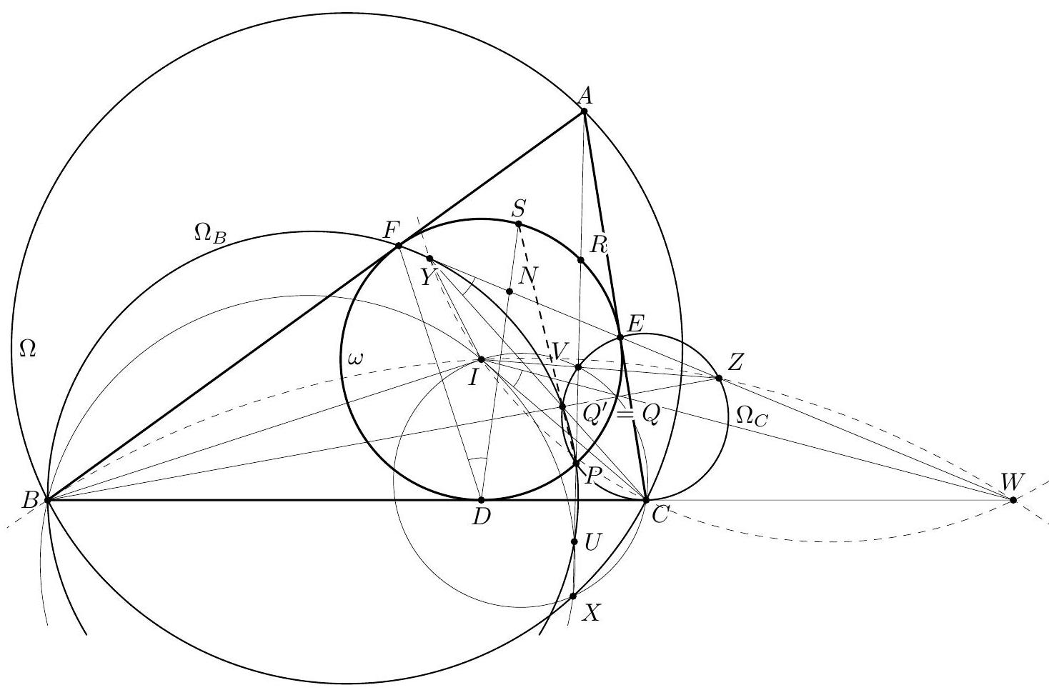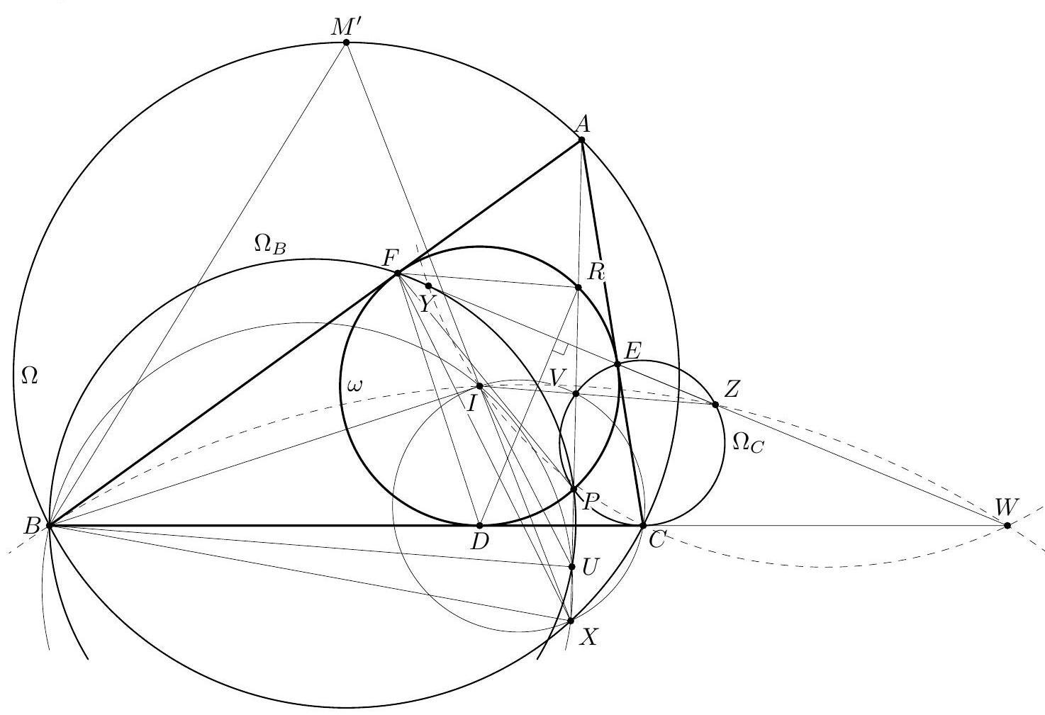 We use the notation of circles $\Gamma, \omega$, and $\Omega$ as in the previous solution. Let $L$ be the point opposite to $I$ in circle $\Omega$. Then $\angle I A L=\angle I D L=90^{\circ}$, which means that $L$ is the foot of the external bisector of $\angle A$ in triangle $A B C$. Let $L I$ cross $\Gamma$ again at $M$. Let $T$ be the foot of the perpendicular from $I$ onto $I_{A} L$. Then $T$ is the second intersection point of $\Gamma$ and $\Gamma$. We will show that $T$ is the desired tangency point. First, we show that $T$ lies on circle $\omega$. Notice that $$ \Varangle(L T, L M)=\Varangle(A T, A I) \quad \text { and } \quad \Varangle(M T, M L)=\Varangle(M T, M I)=\Varangle\left(I_{A} T, I_{A} I\right), $$ which shows that triangles $T M L$ and $T I_{A} A$ are similar and equioriented. So there exists a rotational homothety $\tau$ mapping $T M L$ to $T I_{A} A$. Since $\Varangle(M L, L D)=\Varangle(A I, A D)$, we get $\tau(B C)=A D$. Next, since $$ \Varangle(M B, M L)=\Varangle(M B, M I)=\Varangle\left(I_{A} B, I_{A} I\right)=\Varangle\left(I_{A} E, I_{A} A\right), $$ we get $\tau(B)=E$. Similarly, $\tau(C)=F$. Since the points $M, B, C$, and $T$ are concyclic, so are their $\tau$-images, which means that $T$ lies on $\omega=\tau(\Gamma)$.  Finally, since $\tau(L)=A$ and $\tau(B)=E$, triangles $A T L$ and $E T B$ are similar so that $$ \Varangle(A T, A L)=\Varangle(E T, E B)=\Varangle\left(E I_{A}, E T\right) . $$ This means that the tangents to $\Omega$ and $\omega$ at $T$ make the same angle with the line $I_{A} T L$, so the circles are indeed tangent at $T$. Comment. In both solutions above, a crucial step is a guess that the desired tangency point lies on $\Gamma$. There are several ways to recognize this helpful property. E.g. one may perform some angle chasing to see that the tangents to $\Omega$ at $L$ and to $\omega$ at $I_{A}$ are parallel (and the circles lie on different sides of the tangents). This yields that, under the assumption that the circles are tangent externally, the tangency point must lie on $I_{A} L$. Since $I L$ is a diameter in $\Omega$, this, in turn, implies that $T$ is the projection of $I$ onto $I_{A} L$. Another way to see the same fact is to perform a homothety centered at $A$ and mapping $I$ to $I_{A}$ (and $D$ to some point $D^{\prime}$ ). The image $\Omega^{\prime}$ of $\Omega$ is tangent to $\omega$ at $I_{A}$, because $\angle B I_{A} A+\angle C I_{A} D^{\prime}=180^{\circ}$. This yields that the tangents to $\Omega$ at $I$ and to $\omega$ at $I_{A}$ are parallel. There are other ways to describe the tangency point. The next solution presents one of them.