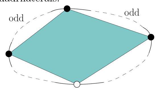 In a regular 100-gon, 41 vertices are colored black and the remaining 59 vertices are colored white. Prove that there exist 24 convex quadrilaterals $Q_{1}, \ldots, Q_{24}$ whose corners are vertices of the 100 -gon, so that - the quadrilaterals $Q_{1}, \ldots, Q_{24}$ are pairwise disjoint, and - every quadrilateral $Q_{i}$ has three corners of one color and one corner of the other color. (Austria)
