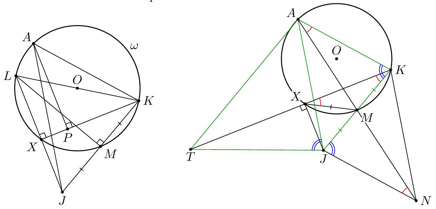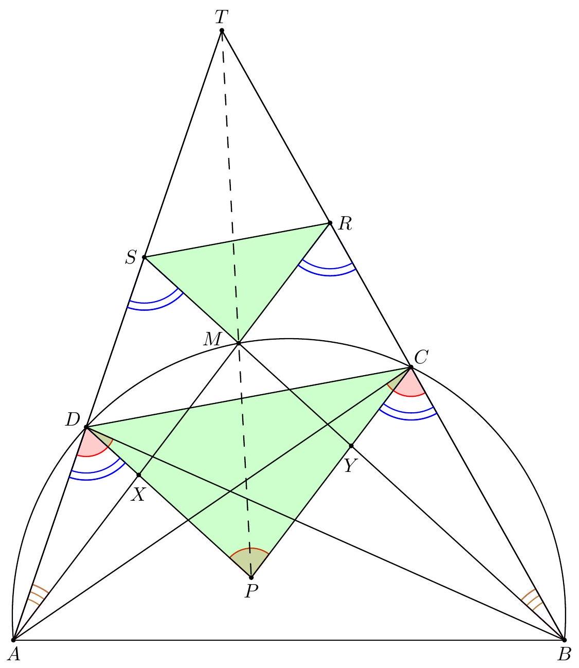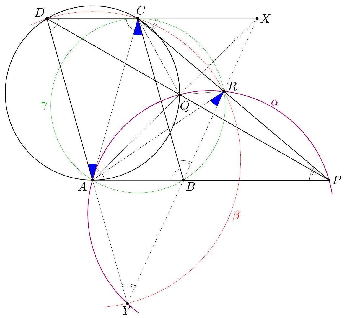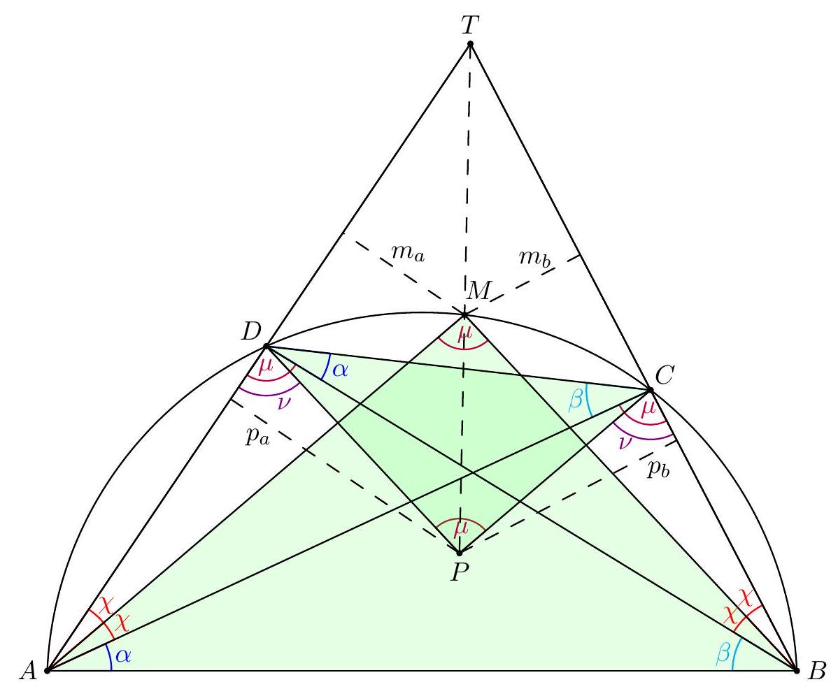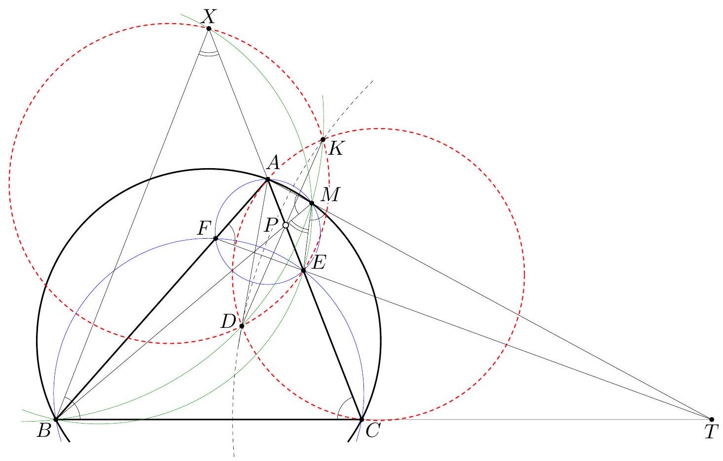 Let $A D$ and $B C$ meet at $T$. Denote by $p_{a}, p_{b}, m_{a}$ and $m_{b}$ the distances between line $T A$ and $P, T B$ and $P, T A$ and $M$ and between $T B$ and $M$ respectively. Our goal is to prove $p_{a}: p_{b}=m_{a}: m_{b}$ which is equivalent to the collinearity of $T, P$ and $M$.  Let $\angle B A C=\angle B D C=\alpha, \angle D B A=\angle D C A=\beta, \angle A D B=\angle A M B=\angle A C B=$ $\angle C P D=\mu, \angle A D P=\angle P C B=\nu$ and $\angle M A D=\angle C A M=\angle M B D=\angle C B M=\chi$. From $\angle A D P=\angle P C B=\nu$ and $\angle M A D=\angle C B M=\chi$ we get $$ \frac{p_{a}}{p_{b}}=\frac{P D \cdot \sin \nu}{P C \cdot \sin \nu}=\frac{P D}{P C} \quad \text { and } \quad \frac{m_{a}}{m_{b}}=\frac{M A \cdot \sin \chi}{M B \cdot \sin \chi}=\frac{M A}{M B} . $$ Hence $p_{a}: p_{b}=m_{a}: m_{b}$ is equivalent to $P D: P C=M A: M B$, and since $\angle C P D=\angle A M B=$ $\mu$, this means we have to show that triangles $P D C$ and $M A B$ are similar. In triangle $P D C$ we have $$ \begin{aligned} & \angle P D C+\angle D C P=180^{\circ}-\angle C P D=180^{\circ}-\mu \\ & \angle P D C-\angle D C P=(\alpha+\mu-\nu)-(\beta+\mu-\nu)=\alpha-\beta . \end{aligned} $$ Similarly, in triangle $M A B$ we have $$ \begin{aligned} & \angle B A M+\angle M B A=180^{\circ}-\angle A M B=180^{\circ}-\mu, \\ & \angle B A M-\angle M B A=(\alpha+\chi)-(\beta+\chi)=\alpha-\beta . \end{aligned} $$ Therefore, $(\angle B A M, \angle M B A)$ and $(\angle P D C, \angle D C P)$ satisfy the same system of linear equations. The common solution is $$ \angle B A M=\angle P D C=\frac{180^{\circ}-\mu+\alpha-\beta}{2} \text { and } \angle M B A=\angle D C P=\frac{180^{\circ}-\mu-\alpha+\beta}{2} . $$ Hence triangles $P D C$ and $M A B$ have equal angles and so are similar. This completes the proof.