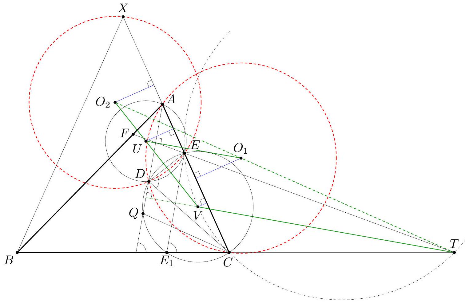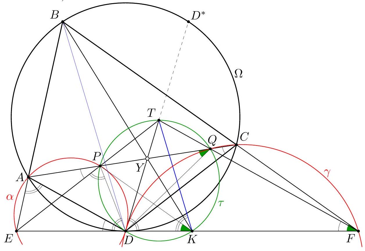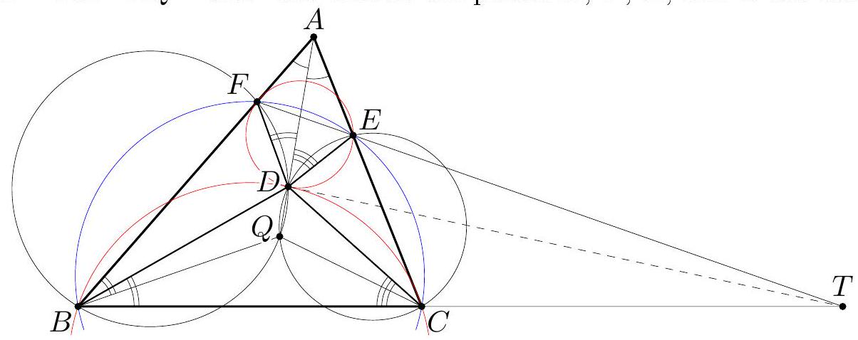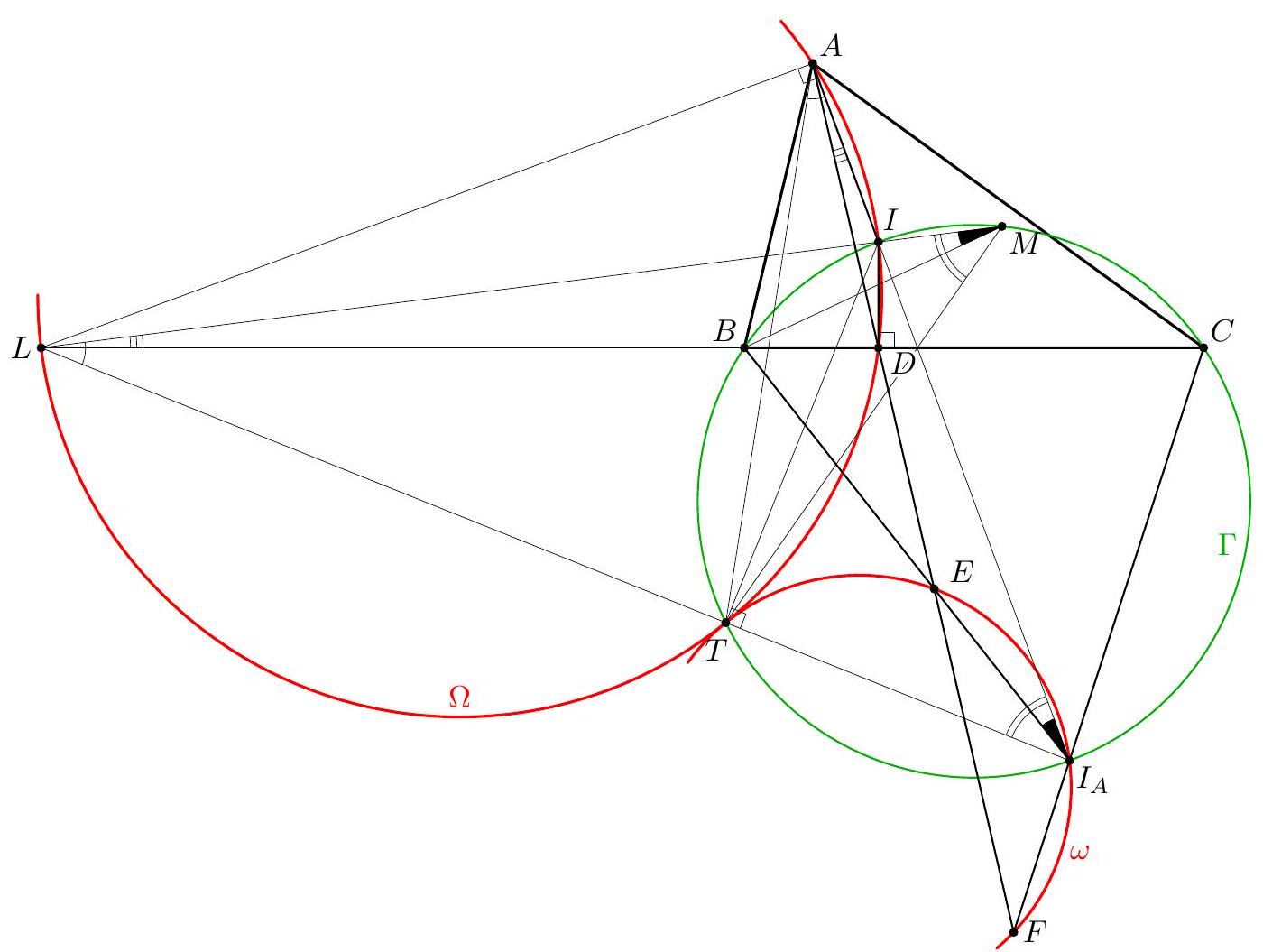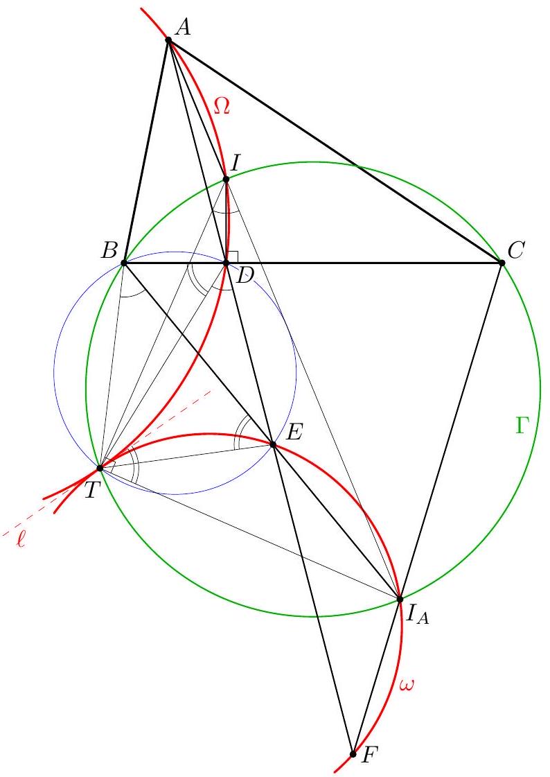 We use the notation of circles $\Gamma, \omega$, and $\Omega$ as in the previous solution. Let $L$ be the point opposite to $I$ in circle $\Omega$. Then $\angle I A L=\angle I D L=90^{\circ}$, which means that $L$ is the foot of the external bisector of $\angle A$ in triangle $A B C$. Let $L I$ cross $\Gamma$ again at $M$. Let $T$ be the foot of the perpendicular from $I$ onto $I_{A} L$. Then $T$ is the second intersection point of $\Gamma$ and $\Gamma$. We will show that $T$ is the desired tangency point. First, we show that $T$ lies on circle $\omega$. Notice that $$ \Varangle(L T, L M)=\Varangle(A T, A I) \quad \text { and } \quad \Varangle(M T, M L)=\Varangle(M T, M I)=\Varangle\left(I_{A} T, I_{A} I\right), $$ which shows that triangles $T M L$ and $T I_{A} A$ are similar and equioriented. So there exists a rotational homothety $\tau$ mapping $T M L$ to $T I_{A} A$. Since $\Varangle(M L, L D)=\Varangle(A I, A D)$, we get $\tau(B C)=A D$. Next, since $$ \Varangle(M B, M L)=\Varangle(M B, M I)=\Varangle\left(I_{A} B, I_{A} I\right)=\Varangle\left(I_{A} E, I_{A} A\right), $$ we get $\tau(B)=E$. Similarly, $\tau(C)=F$. Since the points $M, B, C$, and $T$ are concyclic, so are their $\tau$-images, which means that $T$ lies on $\omega=\tau(\Gamma)$.  Finally, since $\tau(L)=A$ and $\tau(B)=E$, triangles $A T L$ and $E T B$ are similar so that $$ \Varangle(A T, A L)=\Varangle(E T, E B)=\Varangle\left(E I_{A}, E T\right) . $$ This means that the tangents to $\Omega$ and $\omega$ at $T$ make the same angle with the line $I_{A} T L$, so the circles are indeed tangent at $T$. Comment. In both solutions above, a crucial step is a guess that the desired tangency point lies on $\Gamma$. There are several ways to recognize this helpful property. E.g. one may perform some angle chasing to see that the tangents to $\Omega$ at $L$ and to $\omega$ at $I_{A}$ are parallel (and the circles lie on different sides of the tangents). This yields that, under the assumption that the circles are tangent externally, the tangency point must lie on $I_{A} L$. Since $I L$ is a diameter in $\Omega$, this, in turn, implies that $T$ is the projection of $I$ onto $I_{A} L$. Another way to see the same fact is to perform a homothety centered at $A$ and mapping $I$ to $I_{A}$ (and $D$ to some point $D^{\prime}$ ). The image $\Omega^{\prime}$ of $\Omega$ is tangent to $\omega$ at $I_{A}$, because $\angle B I_{A} A+\angle C I_{A} D^{\prime}=180^{\circ}$. This yields that the tangents to $\Omega$ at $I$ and to $\omega$ at $I_{A}$ are parallel. There are other ways to describe the tangency point. The next solution presents one of them.