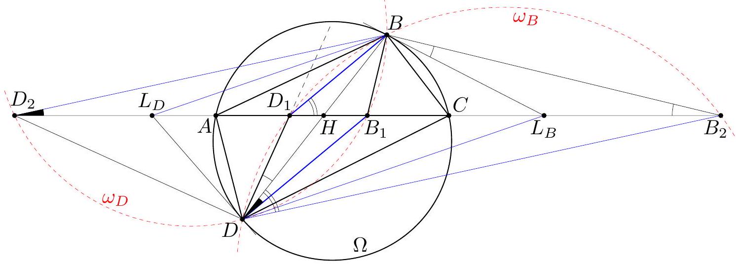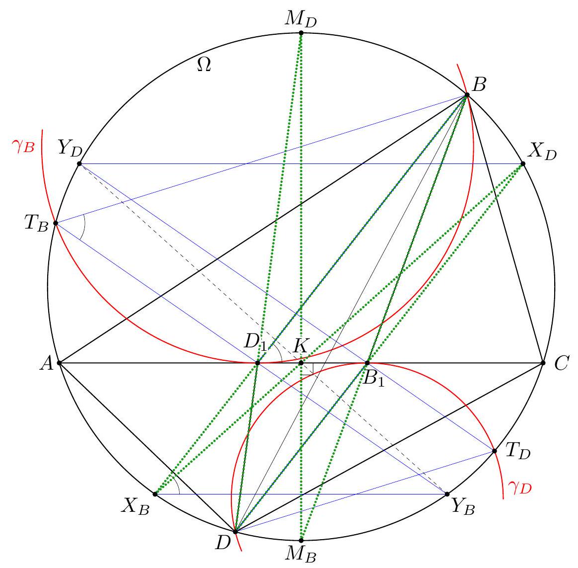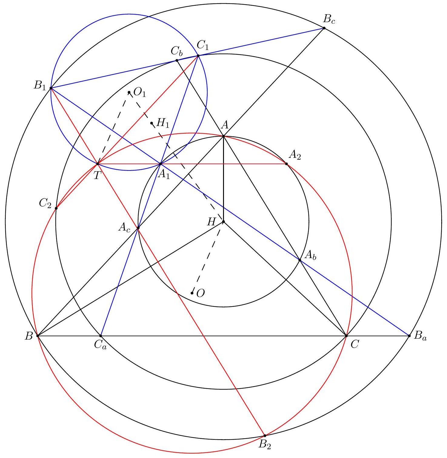 We use the same notation $A_{b}, A_{c}, B_{c}, B_{a}, C_{a}, C_{b}$ and $A_{1}, B_{1}, C_{1}, O_{1}, H_{1}$ as in Let $O$ be the circumcentre of $\triangle A B C$ and $A_{2}$ be the reflection of $A_{1}$ in $A H$. As $\odot A A_{b} A_{c}$ is centred at $H, A_{2}$ also lies on this circle. By Claim 2, $\Varangle B_{a} A_{1} C_{a}=\Varangle A_{b} A A_{c}=\Varangle B_{a} A C_{a}$, so $A_{1}$ lies on $\odot A B_{a} C_{a}$. Reflecting this in $A H$ gives that $A_{2}$ lies on $\odot A B C$. We now have circles centred at $O$ and $H$ passing through $A$ and $A_{2}$ so these points are symmetric with respect to $O H$. Define $B_{2}$ and $C_{2}$ similarly then $\triangle A B C$ and $\triangle A_{2} B_{2} C_{2}$ are symmetric with respect to $O H$ and also $\odot A B C=\odot A_{2} B_{2} C_{2}$.  Claim 4. $A_{1} A_{2}, B_{1} B_{2}$ and $C_{1} C_{2}$ have an intersection on $\odot A B C$ which we denote by $T$. Proof. Let $T=A_{1} A_{2} \cap B_{1} B_{2}$. Since $A_{1} A_{2} \| B C$ and $B_{1} B_{2} \| A C$, we have $$ \Varangle A_{2} T B_{2}=\Varangle B C A=-\Varangle B_{2} C_{2} A_{2}=\Varangle A_{2} C_{2} B_{2} . $$ So $T$ lies on $\odot A_{2} B_{2} C_{2}=\odot A B C$. Similarly the intersection of $A_{1} A_{2}$ and $C_{1} C_{2}$ lies on $\odot A B C$, so $C_{1} C_{2}$ also passes through $T$. Claim 5. $T$ also lies on $\odot A_{1} B_{1} C_{1}$ and $T$ corresponds to $T$ itself under the similarity $\triangle A_{1} B_{1} C_{1} \approx$ $\triangle A B C$. Proof. We know $\triangle A_{1} B_{1} C_{1} \sim \triangle A B C$ by Claim 3. We also have $$ \Varangle B_{1} T C_{1}=\Varangle B_{2} T C_{2}=\Varangle B_{2} A_{2} C_{2}=-\Varangle B A C \stackrel{\text { Claim } 3}{=} \not B_{1} A_{1} C_{1}, $$ so $T$ lies on $\odot A_{1} B_{1} C_{1}$. The remaining part is concluded by the following angle chase: $$ \Varangle A_{1} B_{1} T=\Varangle A_{1} B_{1} B_{2} \stackrel{B_{1} B_{2} \| A C}{\underline{\|}} \npreceq A_{1} A_{b} A=\Varangle A_{1} A_{2} A=-\Varangle A A_{2} T=-\Varangle A B T . $$ Claim 6. The circumradius of $\triangle A_{1} B_{1} C_{1}$ is equal to $H O$. Proof. Two circles centred at $H$ intersect $\ell_{c}$ at $A_{1}, A_{b}$ and $B_{1}, B_{a}$, so $A_{1} A_{b}$ and $B_{1} B_{a}$ have the same midpoint and thus $A_{1} B_{1}=A_{b} B_{a}$. Consider the spiral symmetry $\triangle A A_{b} A_{c} \stackrel{\downarrow}{\sim} \triangle A B_{a} C_{a}$. This takes $H$, the circumcentre of $\triangle A A_{b} A_{c}$, to the circumcentre of $\triangle A B_{a} C_{a}$, denoted by $O_{a}$, which is symmetric to $O$ in $A H$. Hence $\triangle A A_{b} B_{a} \stackrel{ \pm}{\sim} \triangle A H O_{a}$, so $$ \frac{A A_{b}}{B_{a} A_{b}}=\frac{A H}{H O_{a}}=\frac{A H}{H O} \Longrightarrow \frac{A H}{A A_{b}}=\frac{H O}{A_{b} B_{a}} . $$ Also since $\triangle A_{1} O_{1} B_{1} \stackrel{\downarrow}{\sim} \triangle A H A_{b}$ (both of them are $\approx \triangle A O B$ ), we have $$ \frac{A_{1} O_{1}}{A_{1} B_{1}}=\frac{A H}{A A_{b}}=\frac{H O}{A_{b} B_{a}}=\frac{H O}{A_{1} B_{1}} \Longrightarrow A_{1} O_{1}=H O $$ as desired.
