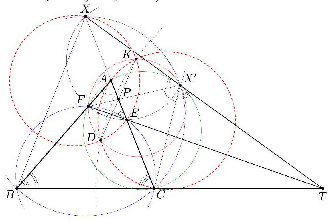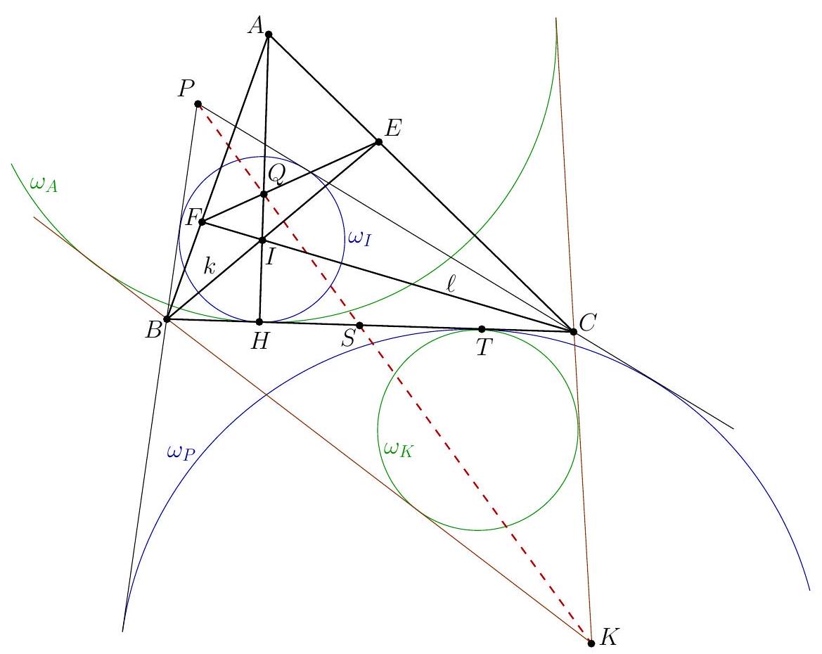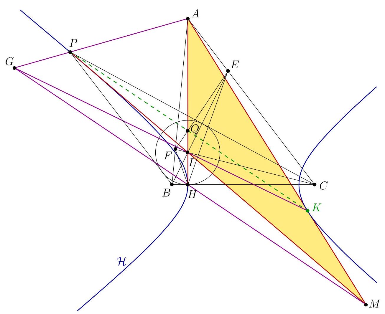 Again, let $B E$ and $C F$ meet at $I$, that is the incentre in triangle $B C P$; then $P I$ is the third angle bisector. From the tangent segments of the incircle we have $B P-C P=$ $B H-C H$; hence, the possible points $P$ lie on a branch of a hyperbola $\mathcal{H}$ with foci $B, C$, and $H$ is a vertex of $\mathcal{H}$. Since $P I$ bisects the angle between the radii $B P$ and $C P$ of the hyperbola, line $P I$ is tangent to $\mathcal{H}$.  Let $K$ be the second intersection of $P Q$ and $\mathcal{H}$, we will show that $A K$ is tangent to $\mathcal{H}$ at $K$; this property determines $K$. Let $G=K I \cap A P$ and $M=P I \cap A K$. From the complete quadrangle $B C E F$ we can see that $(H, Q ; I, A)$ is harmonic, so in the complete quadrangle $A P I K$, point $H$ lies on line $G M$. Consider triangle $A I M$. Its side $A I$ is tangent to $\mathcal{H}$ at $H$, the side $I M$ is tangent to $\mathcal{H}$ at $P$, and $K$ is a common point of the third side $A M$ and the hyperbola such that the lines $A P$, $I K$ and $M H$ are concurrent at the generalised Gergonne-point $G$. It follows that the third side, $A M$ is also tangent to $\mathcal{H}$ at $K$. (Alternatively, in the last step we can apply the converse of Brianchon's theorem to the degenerate hexagon $A H I P M K$. By the theorem there is a conic section $\mathcal{H}^{\prime}$ such that lines $A I, I M$ and $M A$ are tangent to $\mathcal{H}^{\prime}$ at $H, P$ and $K$, respectively. But the three points $H, K$ and $P$, together with the tangents at $H$ and $P$ uniquely determine $\mathcal{H}^{\prime}$, so indeed $\mathcal{H}^{\prime}=\mathcal{H}$.)