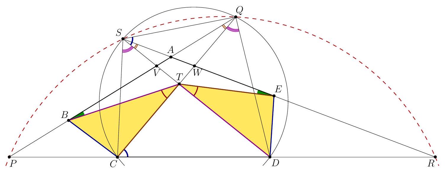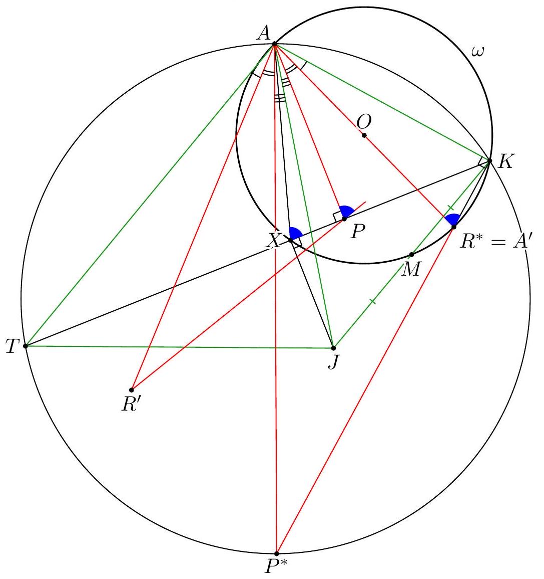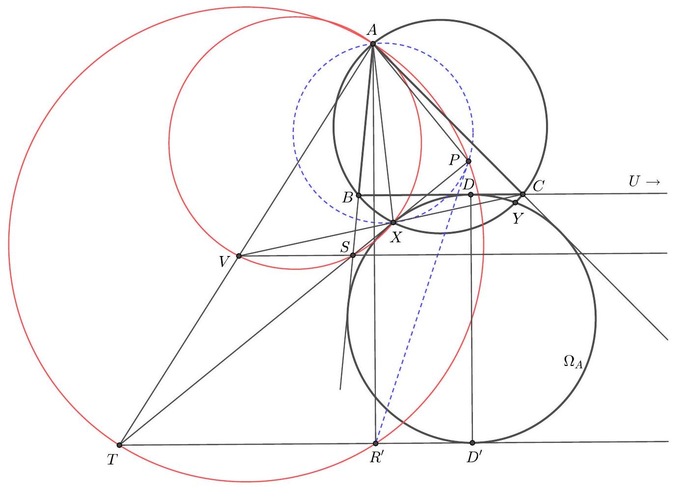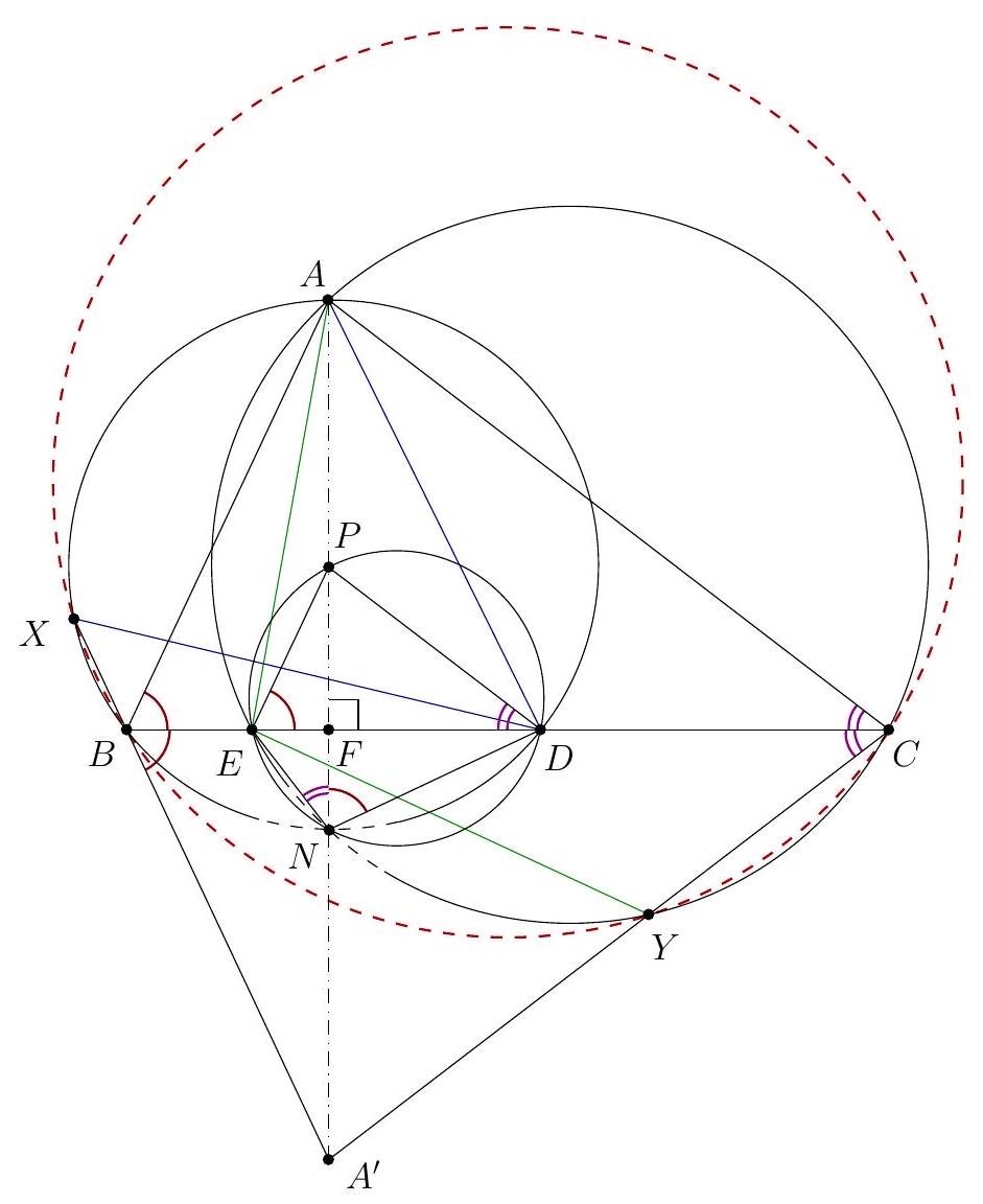 We present another way to prove that line $A P A^{\prime}$ is the radical axis of the circles $A B D$ and $A C E$. It suffices to show that the second intersection point of $A B D$ and $A C E$ lies on $A P$. Define $N$ to be the second intersection of circle $P D E$ and $A P$. From $\angle D N A=\angle D N P=$ $\angle D E P=\angle D B A$ it follows that $N$ lies on circle $A B D$; analogously, we can show that $N$ lies on circle $A C E$.