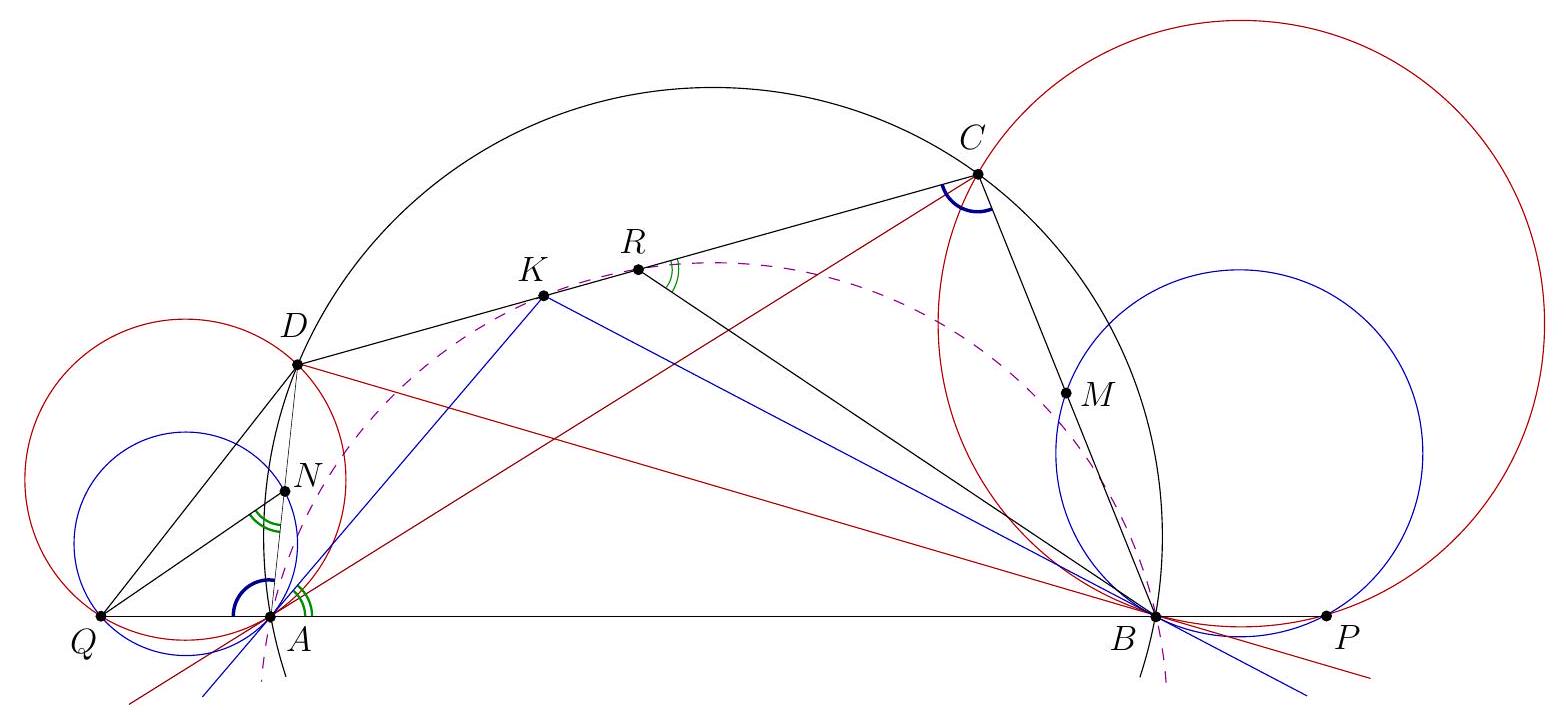 We first prove that triangles $A D Q$ and $C D B$ are similar. Since $A B C D$ is cyclic, we have $\angle D A Q=\angle D C B$. By the tangency of $A C$ to the circle $A Q D$ we also have $\angle C B D=\angle C A D=\angle A Q D$. The claimed similarity is proven. Let $R$ be the midpoint of $C D$. Points $N$ and $R$ correspond in the proven similarity, and so $\angle Q N A=\angle B R C$.  Let $K$ be the second common point of line $C D$ with circle $A B R$ (i.e., if $C D$ intersects circle $A B R$, then $K \neq R$ is the other intersection; otherwise, if $C D$ is tangent to $C D$, then $K=R$ ). In both cases, we have $\angle B A K=\angle B R C=\angle Q N A$; that indicates that $A K$ is tangent to circle $A N Q$. It can be showed analogously that $B K$ is tangent to circle $B M P$. Comment. Note that $M$ and $N$ can be any points on lines $B C$ and $A D$ such that $B M: M C=$ $D N: N A$, as we then simply choose $R$ to be such that $D R: R C$ is that same ratio, and the rest of the proof remains unchanged.