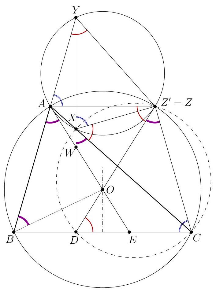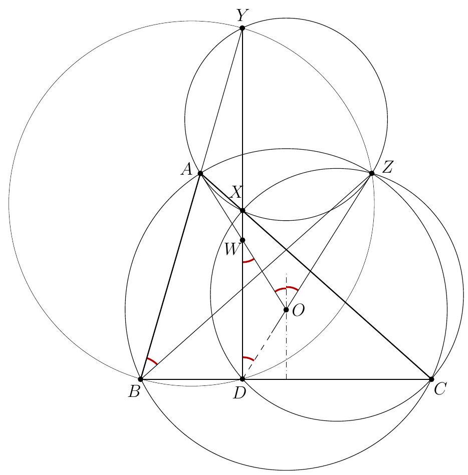 Notice that point $Z$ is the Miquel-point of lines $A C, B C, B A$ and $D Y$; then $B, D, Z, Y$ and $C, D, X, Y$ are concyclic. Moreover, $Z$ is the centre of the spiral similarity that maps $B C$ to $Y X$. By $B C \perp Y X$, the angle of that similarity is $90^{\circ}$; hence the circles $A B C Z$ and $A X Y Z$ are perpendicular, therefore the radius $O Z$ in circle $A B C Z$ is tangent to circle $A X Y Z$.  By $O W=O D$, the triangle $O W D$ is isosceles, and $$ \angle Z O A=2 \angle Z B A=2 \angle Z B Y=2 \angle Z D Y=\angle O D W+\angle D W O, $$ so $D$ lies on line $Z O$ that is tangent to circle $A X Y$.