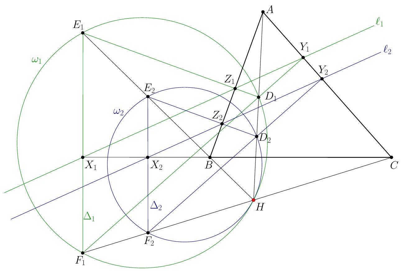 Throughout the solutions, $\Varangle(p, q)$ will denote the directed angle between lines $p$ and $q$, taken modulo $180^{\circ}$. Let the vertices of $\Delta_{i}$ be $D_{i}, E_{i}, F_{i}$, such that lines $E_{i} F_{i}, F_{i} D_{i}$ and $D_{i} E_{i}$ are the perpendiculars through $X, Y$ and $Z$, respectively, and denote the circumcircle of $\Delta_{i}$ by $\omega_{i}$. In triangles $D_{1} Y_{1} Z_{1}$ and $D_{2} Y_{2} Z_{2}$ we have $Y_{1} Z_{1} \| Y_{2} Z_{2}$ because they are parts of $\ell_{1}$ and $\ell_{2}$. Moreover, $D_{1} Y_{1} \| D_{2} Y_{2}$ are perpendicular to $A C$ and $D_{1} Z_{1} \| D_{2} Z_{2}$ are perpendicular to $A B$, so the two triangles are homothetic and their homothetic centre is $Y_{1} Y_{2} \cap Z_{1} Z_{2}=A$. Hence, line $D_{1} D_{2}$ passes through $A$. Analogously, line $E_{1} E_{2}$ passes through $B$ and $F_{1} F_{2}$ passes through $C$.  The corresponding sides of $\Delta_{1}$ and $\Delta_{2}$ are parallel, because they are perpendicular to the respective sides of triangle $A B C$. Hence, $\Delta_{1}$ and $\Delta_{2}$ are either homothetic, or they can be translated to each other. Using that $B, X_{2}, Z_{2}$ and $E_{2}$ are concyclic, $C, X_{2}, Y_{2}$ and $F_{2}$ are concyclic, $Z_{2} E_{2} \perp A B$ and $Y_{2}, F_{2} \perp A C$ we can calculate $$ \begin{aligned} \Varangle\left(E_{1} E_{2}, F_{1} F_{2}\right) & =\Varangle\left(E_{1} E_{2}, X_{1} X_{2}\right)+\Varangle\left(X_{1} X_{2}, F_{1} F_{2}\right)=\Varangle\left(B E_{2}, B X_{2}\right)+\Varangle\left(C X_{2}, C F_{2}\right) \\ & =\Varangle\left(Z_{2} E_{2}, Z_{2} X_{2}\right)+\Varangle\left(Y_{2} X_{2}, Y_{2} F_{2}\right)=\Varangle\left(Z_{2} E_{2}, \ell_{2}\right)+\Varangle\left(\ell_{2}, Y_{2} F_{2}\right) \\ & =\Varangle\left(Z_{2} E_{2}, Y_{2} F_{2}\right)=\Varangle(A B, A C) \not \equiv 0, \end{aligned} $$ and conclude that lines $E_{1} E_{2}$ and $F_{1} F_{2}$ are not parallel. Hence, $\Delta_{1}$ and $\Delta_{2}$ are homothetic; the lines $D_{1} D_{2}, E_{1} E_{2}$, and $F_{1} F_{2}$ are concurrent at the homothetic centre of the two triangles. Denote this homothetic centre by $H$. For $i=1,2$, using (1), and that $A, Y_{i}, Z_{i}$ and $D_{i}$ are concyclic, $$ \begin{aligned} \Varangle\left(H E_{i}, H F_{i}\right) & =\Varangle\left(E_{1} E_{2}, F_{1} F_{2}\right)=\Varangle(A B, A C) \\ & =\Varangle\left(A Z_{i}, A Y_{i}\right)=\Varangle\left(D_{i} Z_{i}, D_{i} Y_{i}\right)=\Varangle\left(D_{i} E_{i}, D_{i} F_{i}\right), \end{aligned} $$ so $H$ lies on circle $\omega_{i}$. The same homothety that maps $\Delta_{1}$ to $\Delta_{2}$, sends $\omega_{1}$ to $\omega_{2}$ as well. Point $H$, that is the centre of the homothety, is a common point of the two circles, That finishes proving that $\omega_{1}$ and $\omega_{2}$ are tangent to each other.