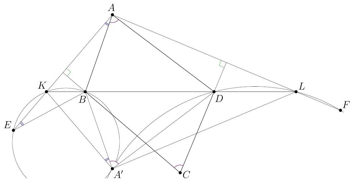 Denote by $A^{\prime}$ the reflection of $A$ in $B D$. We will show that that the quadrilaterals $A^{\prime} B K E$ and $A^{\prime} D L F$ are cyclic, and their circumcircles are tangent to each other at point $A^{\prime}$. From the symmetry about line $B C$ we have $\angle B E K=\angle B A K$, while from the symmetry in $B D$ we have $\angle B A K=\angle B A^{\prime} K$. Hence $\angle B E K=\angle B A^{\prime} K$, which implies that the quadrilateral $A^{\prime} B K E$ is cyclic. Similarly, the quadrilateral $A^{\prime} D L F$ is also cyclic.  For showing that circles $A^{\prime} B K E$ and $A^{\prime} D L F$ are tangent it suffices to prove that $$ \angle A^{\prime} K B+\angle A^{\prime} L D=\angle B A^{\prime} D . $$ Indeed, by $A K \perp B C$, $A L \perp C D$, and again the symmetry in $B D$ we have $$ \angle A^{\prime} K B+\angle A^{\prime} L D=180^{\circ}-\angle K A^{\prime} L=180^{\circ}-\angle K A L=\angle B C D=\angle B A D=\angle B A^{\prime} D, $$ as required. Comment 1. The key to the solution above is introducing the point $A^{\prime}$; then the angle calculations can be done in many different ways.