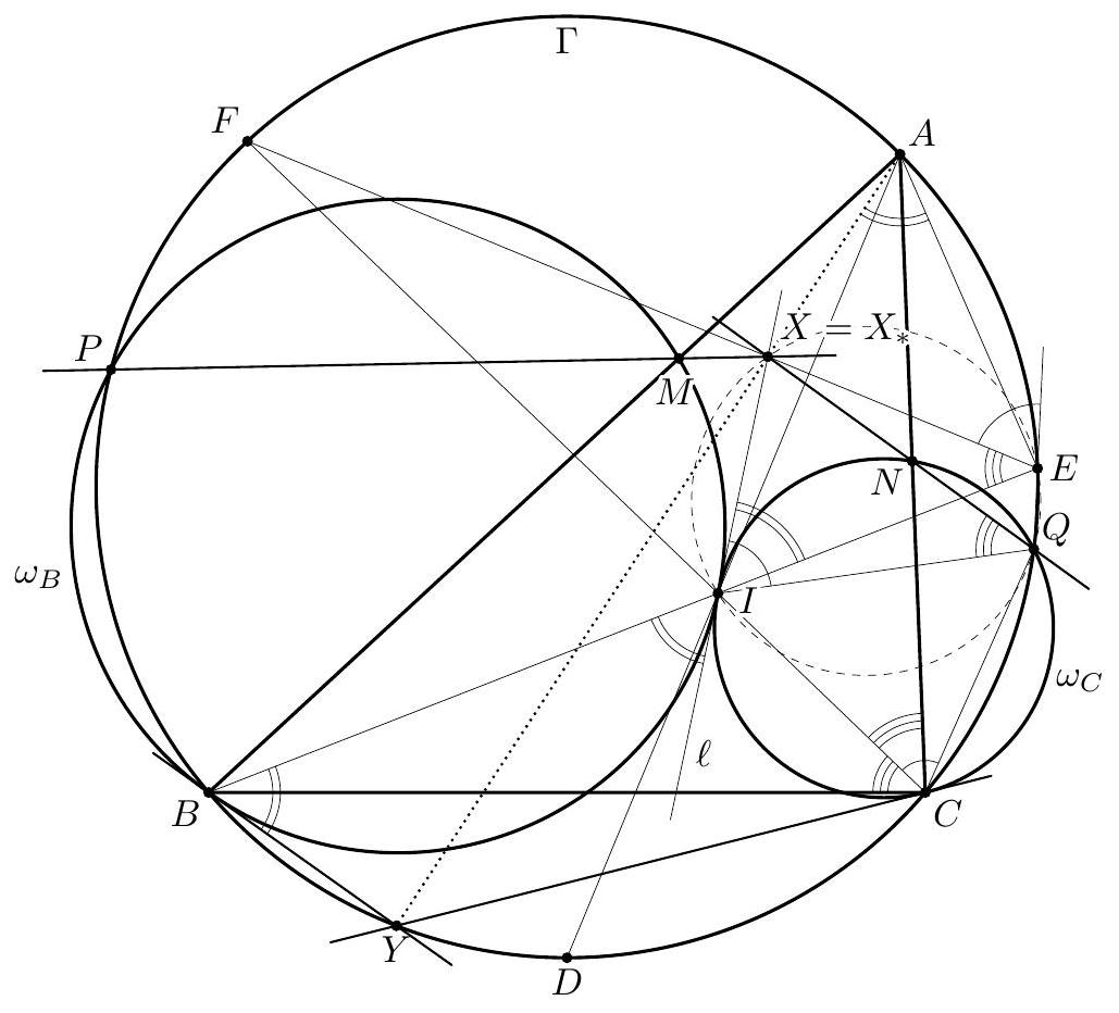 Perform an inversion centered at $I$; the images of the points are denoted by primes, e.g., $A^{\prime}$ is the image of $A$. On the inverted figure, $I$ and $\Gamma^{\prime}$ are the orthocenter and the circumcircle of triangle $A^{\prime} B^{\prime} C^{\prime}$, respectively. The points $P^{\prime}$ and $Q^{\prime}$ lie on $\Gamma^{\prime}$ such that $B^{\prime} P^{\prime} \| C^{\prime} Q^{\prime}$ (since $B^{\prime} P^{\prime}=\omega_{B}^{\prime}$ and $C^{\prime} Q^{\prime}=\omega_{C}^{\prime}$ ). The points $M^{\prime}$ and $N^{\prime}$ are the second intersections of lines $B^{\prime} P^{\prime}$ and $C^{\prime} Q^{\prime}$ with the circumcircles $\gamma_{B}$ and $\gamma_{C}$ of triangles $A^{\prime} I B^{\prime}$ and $A^{\prime} I C^{\prime}$, respectively. Notice here that $\gamma_{C}$ is obtained from $\gamma_{B}$ by the translation at $\overrightarrow{B^{\prime} C^{\prime}}$; the same translation maps line $B^{\prime} P^{\prime}$ to $C^{\prime} Q^{\prime}$, and hence $M^{\prime}$ to $N^{\prime}$. In other words, $B^{\prime} M^{\prime} N^{\prime} C^{\prime}$ is a parallelogram, and $P^{\prime} Q^{\prime}$ partitions it into two isosceles trapezoids. Point $X^{\prime}$ is the second intersection point of circles $\left(I P^{\prime} M^{\prime}\right)$ and $\left(I Q^{\prime} N^{\prime}\right)$ that is - the reflection of $I$ in their line of centers. But the centers lie on the common perpendicular bisector $p$ of $P^{\prime} M^{\prime}$ and $Q^{\prime} N^{\prime}$, so $p$ is that line of centers. Hence, $I X^{\prime} \| B^{\prime} P^{\prime}$, as both lines are perpendicular to $p$. Finally, the point $Y$ satisfies $\Varangle(B Y, B I)=\Varangle(P B, P I)$ and $\Varangle(C Y, C I)=\Varangle(Q C, Q I)$, which yields $\Varangle\left(Y^{\prime} B^{\prime}, Y^{\prime} I\right)=\Varangle\left(B^{\prime} P^{\prime}, B^{\prime} I\right)$ and $\Varangle\left(Y^{\prime} C^{\prime}, Y^{\prime} I\right)=\Varangle\left(C^{\prime} Q^{\prime}, C^{\prime} I\right)$. Therefore, $$ \Varangle\left(Y^{\prime} B^{\prime}, Y^{\prime} C^{\prime}\right)=\Varangle\left(B^{\prime} P^{\prime}, B^{\prime} I\right)+\Varangle\left(C^{\prime} I, C^{\prime} Q^{\prime}\right)=\Varangle\left(C^{\prime} I, B^{\prime} I\right)=\Varangle\left(A^{\prime} B^{\prime}, A^{\prime} C^{\prime}\right), $$ which shows that $Y^{\prime} \in \Gamma^{\prime}$. In congruent circles $\Gamma^{\prime}$ and $\gamma_{B}$, the chords $A^{\prime} P^{\prime}$ and $A^{\prime} M^{\prime}$ subtend the same angle $\angle A^{\prime} B^{\prime} P^{\prime}$; therefore, $A^{\prime} P^{\prime}=A^{\prime} M^{\prime}$, and hence $A^{\prime} \in p$. This yields $A^{\prime} X^{\prime}=A^{\prime} I$, and hence $\Varangle\left(I A^{\prime}, I X^{\prime}\right)=$ $\Varangle\left(X^{\prime} I, X^{\prime} A^{\prime}\right)$ 。 Finally, we have $$ \begin{aligned} \Varangle\left(Y^{\prime} I, Y^{\prime} A^{\prime}\right) & =\Varangle\left(Y^{\prime} I, Y^{\prime} B^{\prime}\right)+\Varangle\left(Y^{\prime} B^{\prime}, Y^{\prime} A^{\prime}\right) \\ & =\Varangle\left(B^{\prime} I, B^{\prime} P^{\prime}\right)+\Varangle\left(I A^{\prime}, I B^{\prime}\right)=\Varangle\left(I A^{\prime}, B^{\prime} P^{\prime}\right)=\Varangle\left(I A^{\prime}, I X^{\prime}\right)=\Varangle\left(X^{\prime} I, X^{\prime} A^{\prime}\right), \end{aligned} $$ which yields that the points $A^{\prime}, X^{\prime}, Y^{\prime}$, and $I$ are concyclic. This means exactly that $A, X$, and $Y$ are collinear.  Comment 2. An inversion at $I$ may also help in establishing Step 2 in Solution 1. Indeed, relation $A^{\prime} X^{\prime}=A^{\prime} I$ yields $X A=X I$, so that $X \in E F$. On the other hand, $I X^{\prime} \| B^{\prime} P^{\prime}$ yields $I X \| \ell$, i.e., $X \in \ell$.