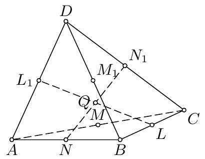 7. The given equations imply $A B=C D, A C=B D, A D=B C$. Let $L_{1}$, $M_{1}, N_{1}$ be the midpoints of $A D, B D, C D$ respectively. Then the above equalities yield $$ \begin{gathered} L_{1} M_{1}=A B / 2=L M \\ L_{1} M_{1}\|A B\| L M \\ L_{1} M=C D / 2=L M_{1} \\ L_{1} M\|C D\| L M_{1} \end{gathered} $$ Thus $L, M, L_{1}, M_{1}$ are coplanar and $L M L_{1} M_{1}$ is a rhombus as well as  $M N M_{1} N_{1}$ and $L N L_{1} N_{1}$. Then the segments $L L_{1}, M M_{1}, N N_{1}$ have the common midpoint $Q$ and $Q L \perp Q M$, $Q L \perp Q N, Q M \perp Q N$. We also infer that the line $N N_{1}$ is perpendicular to the plane $L M L_{1} M_{1}$ and hence to the line $A B$. Thus $Q A=Q B$, and similarly, $Q B=Q C=Q D$, hence $Q$ is just the center $O$, and $\angle L O M=$ $\angle M O N=\angle N O L=90^{\circ}$.