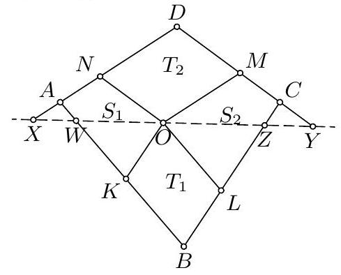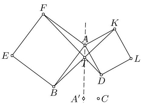 3. Consider two squares $A B^{\prime} C D^{\prime}$ and $A^{\prime} B C^{\prime} D$. Since $A C \perp B D$, these two squares are homothetic, which implies that the lines $A A^{\prime}, B B^{\prime}, C C^{\prime}, D D^{\prime}$ are concurrent at a certain point $O$. Since the rotation about $A$ by $90^{\circ}$ takes $\triangle A B K$ into $\triangle A F D$, it follows that $B K \perp D F$. Denote by $T$ the intersection of $B K$ and $D F$. The rotation about some point $X$ by $90^{\circ}$ maps $B K$ into $D F$ if and only if $T X$ bisects an angle between $B K$ and $D F$. Therefore $\angle F T A=$  $\angle A T K=45^{\circ}$. Moreover, the quadrilateral $B A^{\prime} D T$ is cyclic, which implies that $\angle B T A^{\prime}=B D A^{\prime}=45^{\circ}$ and consequently that the points $A, T, A^{\prime}$ are collinear. It follows that the point $O$ lies on a bisector of $\angle B T D$ and therefore the rotation $\mathcal{R}$ about $O$ by $90^{\circ}$ takes $B K$ into $D F$. Analogously, $\mathcal{R}$ maps the lines $C E, D G, A I$ into $A H, B J, C L$. Hence the quadrilateral $P_{1} Q_{1} R_{1} S_{1}$ is the image of the quadrilateral $P_{2} Q_{2} R_{2} S_{2}$, and the result follows.