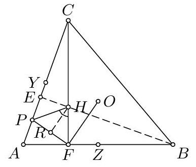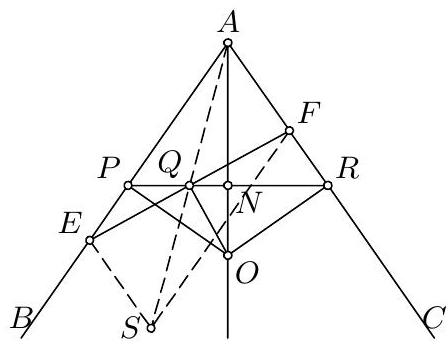 18. (GBR) The altitudes through the vertices $A, B, C$ of an acute-angled triangle $A B C$ meet the opposite sides at $D, E, F$, respectively. The line through $D$ parallel to $E F$ meets the lines $A C$ and $A B$ at $Q$ and $R$, respectively. The line $E F$ meets $B C$ at $P$. Prove that the circumcircle of the triangle $P Q R$ passes through the midpoint of $B C$.