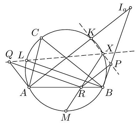 25. Let $M R$ meet the circumcircle of triangle $A B C$ again at a point $X$. We claim that $X$ is the common point of the lines $K P, L Q, M R$. By symmetry, it will be enough to show that $X$ lies on $K P$. It is easy to see that $X$ and $P$ lie on the same side of $A B$ as $K$. Let $I_{a}=A K \cap B P$ be the excenter of $\triangle A B C$ corresponding to $A$. It is easy to calculate that $\angle A I_{a} B=\gamma / 2$, from which we get $\angle R P B=\angle A I_{a} B=\angle M C B=\angle R X B$. Therefore $R, B, P, X$ are concyclic. Now if $P$ and $K$ are on distinct sides of $B X$ (the other case is similar), we have $\angle R X P=180^{\circ}-\angle R B P=90^{\circ}-$ $\beta / 2=\angle M A K=180^{\circ}-\angle R X K$, from which it follows that $K, X, P$ are collinear, as claimed. Remark. It is not essential for the statement of the problem that $R$ be an internal point of $A B$. Work with cases can be avoided using oriented  angles.