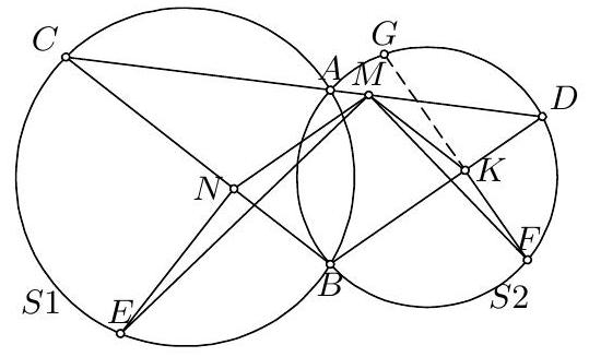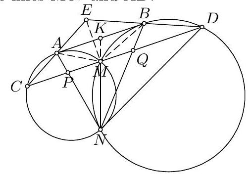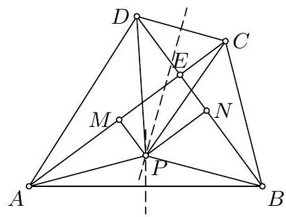 2. (POL) Let $A B C D$ be a cyclic quadrilateral. Let $E$ and $F$ be variable points on the sides $A B$ and $C D$, respectively, such that $A E: E B=C F$ : $F D$. Let $P$ be the point on the segment $E F$ such that $P E: P F=A B$ : $C D$. Prove that the ratio between the areas of triangles $A P D$ and $B P C$ does not depend on the choice of $E$ and $F$.