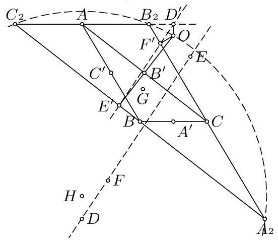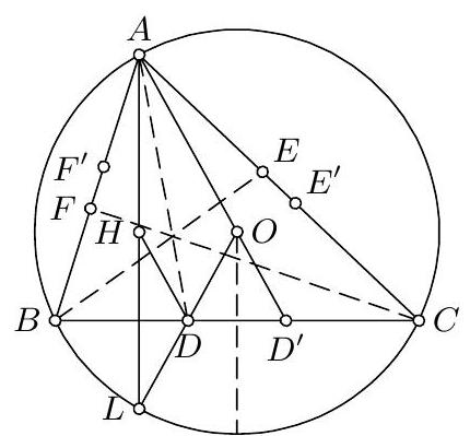 9. Since $\angle B C A=\frac{1}{2} \angle B O A=\angle B O D$, the lines $C A$ and $O D$ are parallel, so that $O D A I$ is a parallelogram. It follows that $A I=O D=O E=A E=$ $A F$. Hence $\angle I F E=\angle I F A-\angle E F A=\angle A I F-\angle E C A=\angle A I F-\angle A C F=\angle C F I$. Also, from $A E=A F$ we get that $C I$ bisects $\angle E C F$. Therefore $I$ is the incenter of $\triangle C E F$.