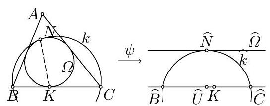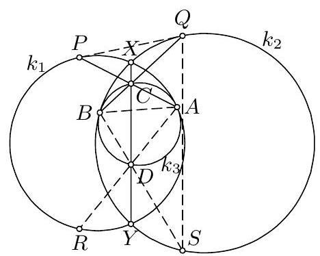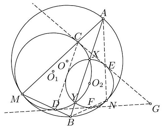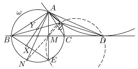 7. To avoid working with cases, we use oriented angles modulo $180^{\circ}$. Let $K$ be the circumcenter of $\triangle B C D$, and $X$ any point on the common tangent to the circles at $D$. Since the tangents at the ends of a chord are equally inclined to the chord, we have $\angle B A C=\angle A B D+\angle B D C+\angle D C A=$ $\angle B D X+\angle B D C+\angle X D C=2 \angle B D C=\angle B K C$. It follows that $B, C, A, K$ are concyclic, as required.