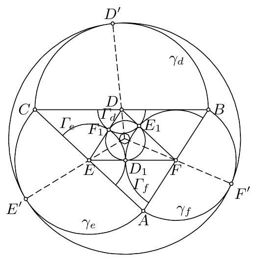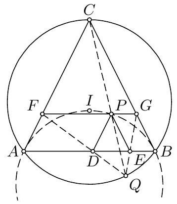 17. The triangles $P D E$ and $C F G$ are homothetic; hence lines $F D, G E$, and $C P$ intersect at one point. Let $Q$ be the intersection point of the line $C P$ and the circumcircle of $\triangle A B C$. The required statement will follow if we show that $Q$ lies on the lines $G E$ and $F D$. Since $\angle C F G=\angle C B A=\angle C Q A$, the quadrilateral $A Q P F$ is cyclic. Analogously, $B Q P G$ is cyclic. However, the isosceles trapezoid $B D P G$ is also cyclic; it follows that $B, Q, D, P, G$ lie on a circle. Therefore we get $$ \angle P Q F=\angle P A C, \angle P Q D=\angle P B A . $$ Since $I$ is the incenter of $\triangle A B C$, we have $\angle C A I=\frac{1}{2} \angle C A B=$ $\frac{1}{2} \angle C B A=\angle I B A$; hence $C A$ is the tangent at $A$ to the circumcircle of $\triangle A B I$. This implies that $\angle P A C=$ $\angle P B A$, and it follows from (1) that $\angle P Q F=\angle P Q D$, i.e., that $F, D, Q$ are also collinear. Similarly, $G, E, Q$ are collinear and the claim is thus proved.