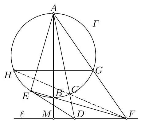 17. Let $H$ be the reflection of $G$ about $A B(G H \| \ell)$. Let $M$ be the intersection of $A B$ and $\ell$. Since $\angle F E A=\angle F M A=90^{\circ}$, it follows that $A E M F$ is cyclic and hence $\angle D F E=\angle B A E=\angle D E F$. The last equality holds because $D E$ is tangent to $\Gamma$. It follows that $D E=$ $D F$ and hence $D F^{2}=D E^{2}=$  $D C \cdot D A$ (the power of $D$ with respect to $\Gamma$ ). It then follows that $\angle D C F=\angle D F A=\angle H G A=\angle H C A$. Thus it follows that $H$ lies on $C F$ as desired.