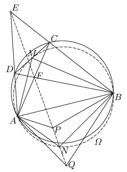 23. G8 (SMN) A cyclic quadrilateral $A B C D$ is given. The lines $A D$ and $B C$ intersect at $E$, with $C$ between $B$ and $E$; the diagonals $A C$ and $B D$ intersect at $F$. Let $M$ be the midpoint of the side $C D$, and let $N \neq M$ be a point on the circumcircle of the triangle $A B M$ such that $A N / B N=$ $A M / B M$. Prove that the points $E, F$, and $N$ are collinear.