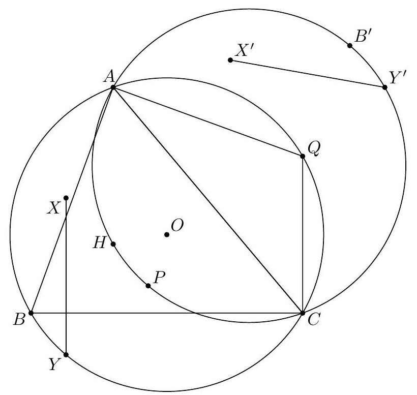 We eliminate the floating orthocenter by reflecting $P$ across $\overline{A C}$ to $Q$. Then $Q$ lies on ( $A B C$ ) and moreover $\angle Q A C=\frac{1}{2} \angle B A C$. This motivates us to reflect $B, X, Y$ to $B^{\prime}$, $X^{\prime}, Y^{\prime}$ and complex bash with respect to $\triangle A Q C$. Obviously $$ y^{\prime}=a+q+c $$ Now we need to compute $x^{\prime}$. You can get this using the formula $$ x^{\prime}=a+\frac{\left(b^{\prime}-a\right)(q-a)\left(\overline{q-a}-\overline{b^{\prime}-a}\right)}{\left(b^{\prime}-a\right) \overline{(q-a)}-\overline{\left(b^{\prime}-a\right)}(q-a)} . $$ Using the angle condition we know $b=\frac{c^{3}}{q^{2}}$, and then that $$ b^{\prime}=a+c-a c \bar{b}=a+c-\frac{a q^{2}}{c^{2}} . $$ Therefore $$ \begin{aligned} x^{\prime} & =a+\frac{\left(c-\frac{a q^{2}}{c^{2}}\right)(q-a)\left(\frac{1}{q}-\frac{1}{a}-\frac{1}{c}+\frac{c^{2}}{a q^{2}}\right)}{\left(c-\frac{a q^{2}}{c^{2}}\right)\left(\frac{1}{q}-\frac{1}{a}\right)-\left(\frac{1}{c}-\frac{c^{2}}{a q^{2}}\right)(q-a)} \\ & =a+\frac{\frac{c^{3}-a q^{2}}{c^{2}}(q-a)\left(\frac{1}{q}-\frac{1}{a}-\frac{1}{c}+\frac{c^{2}}{a q^{2}}\right)}{-\frac{c^{3}-a q^{2}}{c^{2}} \frac{q-a}{q a}+\frac{c^{3}-q^{2}}{a q^{2} c}(q-a)} \end{aligned} $$ $$ \begin{aligned} & =a+\frac{\frac{1}{q}-\frac{1}{a}-\frac{1}{c}+\frac{c^{2}}{a q^{2}}}{-\frac{1}{q a}+\frac{c}{a q^{2}}} \\ & =a+\frac{c^{2}-q^{2}+a q-\frac{a q^{2}}{c}}{c-q} \\ & =a+c+q+\frac{a q}{c} \end{aligned} $$ whence $$ \left|x^{\prime}-y^{\prime}\right|=\left|\frac{a q}{c}\right|=1 $$