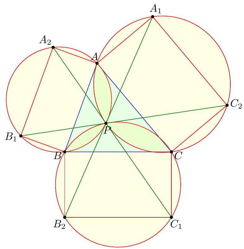 The angle condition implies the circumcircles of the three rectangles concur at a single point $P$.  Then $\measuredangle C P B_{2}=\measuredangle C P A_{1}=90^{\circ}$, hence $P$ lies on $A_{1} B_{2}$ etc., so we're done. Remark. As one might guess from the two-sentence solution, the entire difficulty of the problem is getting the characterization of the concurrence point.
