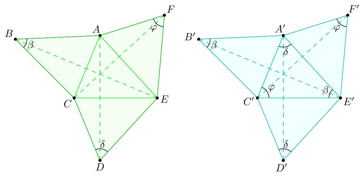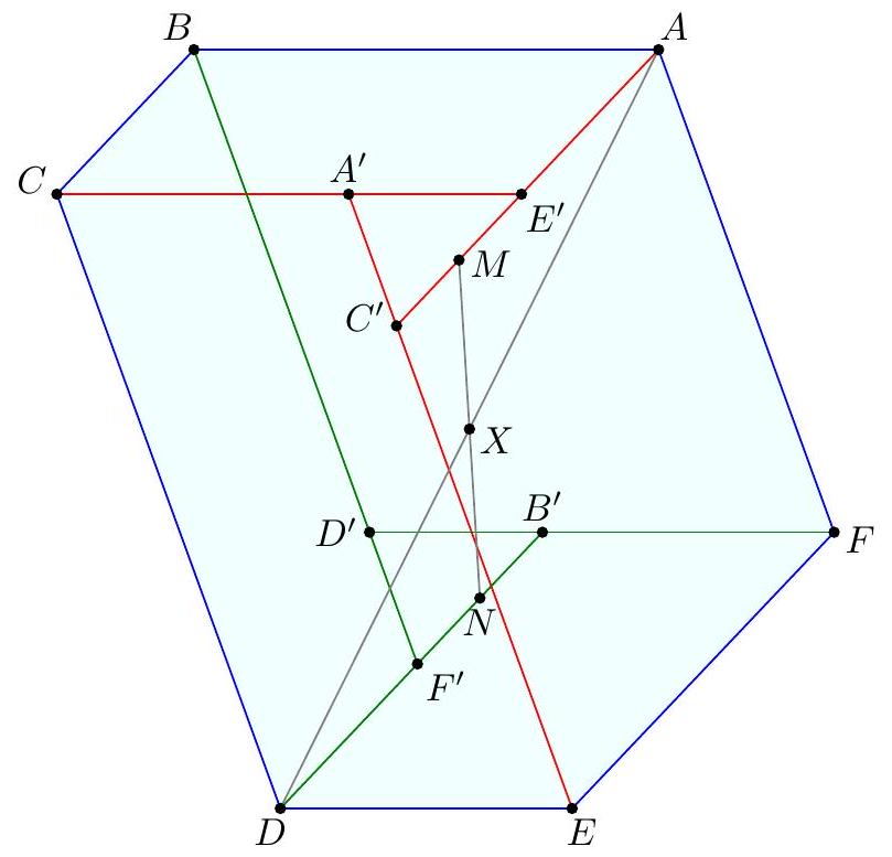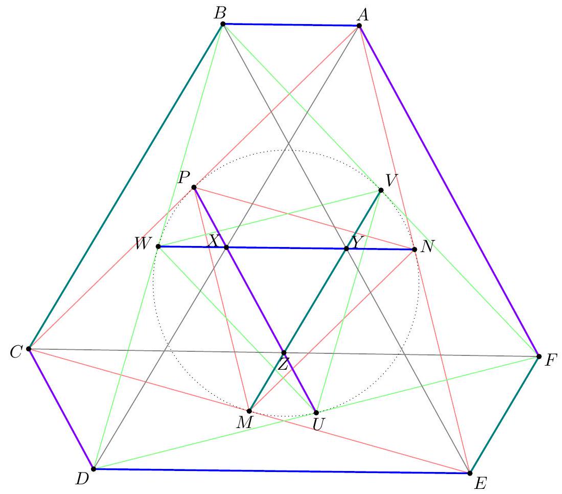 Claim - If $A B \cdot D E=B C \cdot E F=C D \cdot F A=k$, then the circumcenters of $A C E$ and $A^{\prime} C^{\prime} E^{\prime}$ coincide.  Claim - Triangle $X Y Z$ is the vector average of the (congruent) medial triangles of triangles $A^{\prime} C^{\prime} E^{\prime}$ and $B^{\prime} D^{\prime} F^{\prime}$. $$ \begin{aligned} \frac{\vec{M}+\vec{N}}{2} & =\frac{\frac{\vec{C}^{\prime}+\vec{E}^{\prime}}{2}+\frac{\vec{B}^{\prime}+\vec{F}^{\prime}}{2}}{2} \\ & =\frac{\overrightarrow{C^{\prime}}+\vec{E}^{\prime}+\vec{B}^{\prime}+\vec{F}^{\prime}}{4} \\ & =\frac{(\vec{A}+\vec{E}-\vec{F})+(\vec{C}+\vec{A}-\vec{B})+(\vec{D}+\vec{F}-\vec{E})+(\vec{B}+\vec{D}-\vec{C})}{4} \\ & =\frac{\vec{A}+\vec{D}}{2}=\vec{X} . \end{aligned} $$ Hence the orthocenter of $X Y Z$ is the midpoint of the orthocenters of the medial triangles of $A^{\prime} C^{\prime} E^{\prime}$ and $B^{\prime} D^{\prime} F^{\prime}$ - that is, their circumcenters.  Claim - In trapezoid $A B D E$, the perpendicular bisector of $\overline{X Y}$ is the same as the perpendicular bisector of the midline $\overline{W N}$. Claim - The points $V, W, M, N$ are cyclic. $$ W Y \cdot Y N=\frac{1}{2} D E \cdot \frac{1}{2} A B=\frac{1}{2} E F \cdot \frac{1}{2} B C=V Y \cdot Y M $$ Applying all the cyclic variations of the above two claims, it follows that all six points $U, V, W, M, N, P$ are concyclic, and the center of that circle coincides with the circumcenter of $\triangle X Y Z$. Remark. It is also possible to implement ideas from the first solution here, by showing all six midpoints have equal power to $(X Y Z)$. Claim - The orthocenter of $X Y Z$ is the midpoint of the circumcenters of $\triangle A C E$ and $\triangle B D F$. $$ \begin{aligned} \operatorname{orthocenter}(X Y Z) & =x+y+z=\frac{a+b+c+d+e+f}{2} \\ \operatorname{circumcenter}(A C E) & =\operatorname{orthocenter}(M N P) \end{aligned} $$ $$ =m+n+p=\frac{c+e}{2}+\frac{e+a}{2}+\frac{a+c}{2}=a+c+e $$ circumcenter $(B D F)=$ orthocenter $(U V W)$ $$ =u+v+w=\frac{d+f}{2}+\frac{f+b}{2}+\frac{b+d}{2}=b+d+f $$