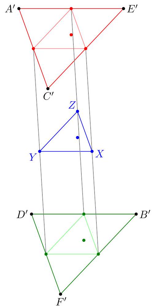 Let $A B C D E F$ be a convex hexagon satisfying $\overline{A B}\|\overline{D E}, \overline{B C}\| \overline{E F}, \overline{C D} \| \overline{F A}$, and $$ A B \cdot D E=B C \cdot E F=C D \cdot F A $$ Let $X, Y$, and $Z$ be the midpoints of $\overline{A D}, \overline{B E}$, and $\overline{C F}$. Prove that the circumcenter of $\triangle A C E$, the circumcenter of $\triangle B D F$, and the orthocenter of $\triangle X Y Z$ are collinear.