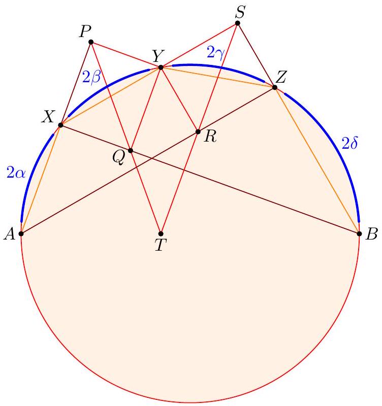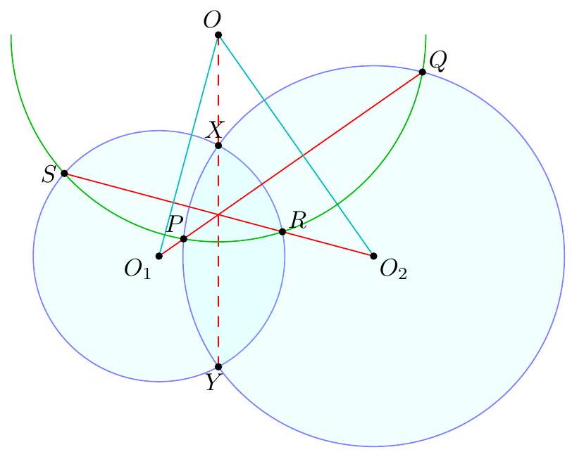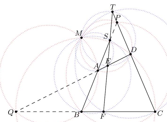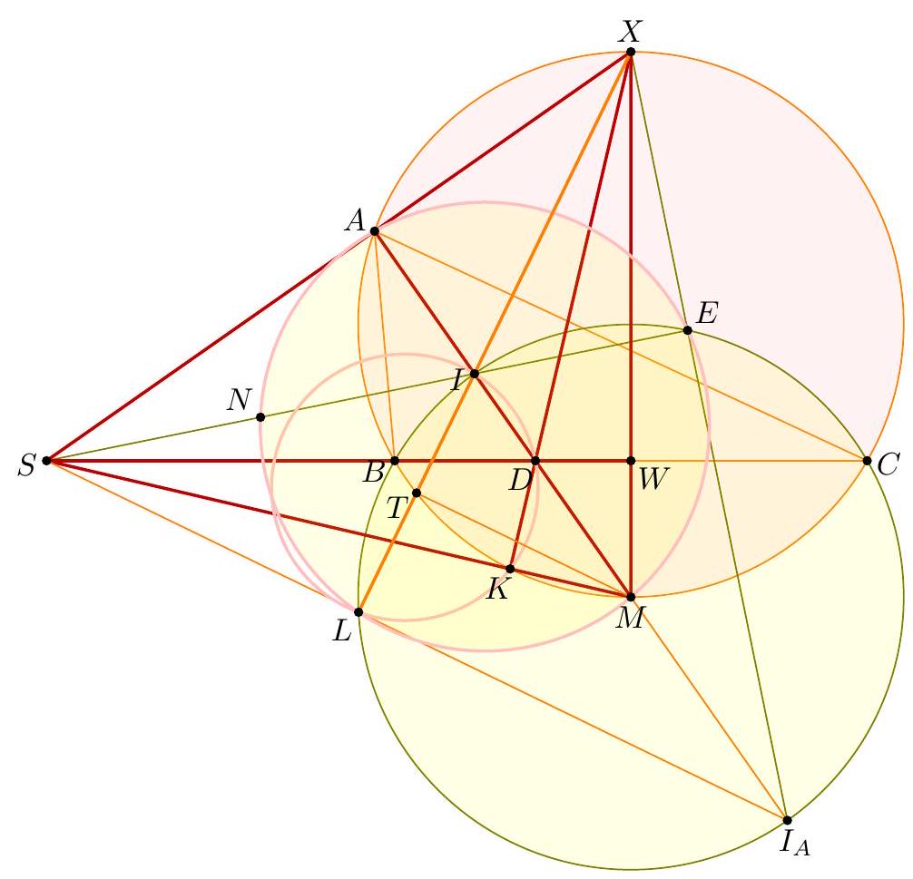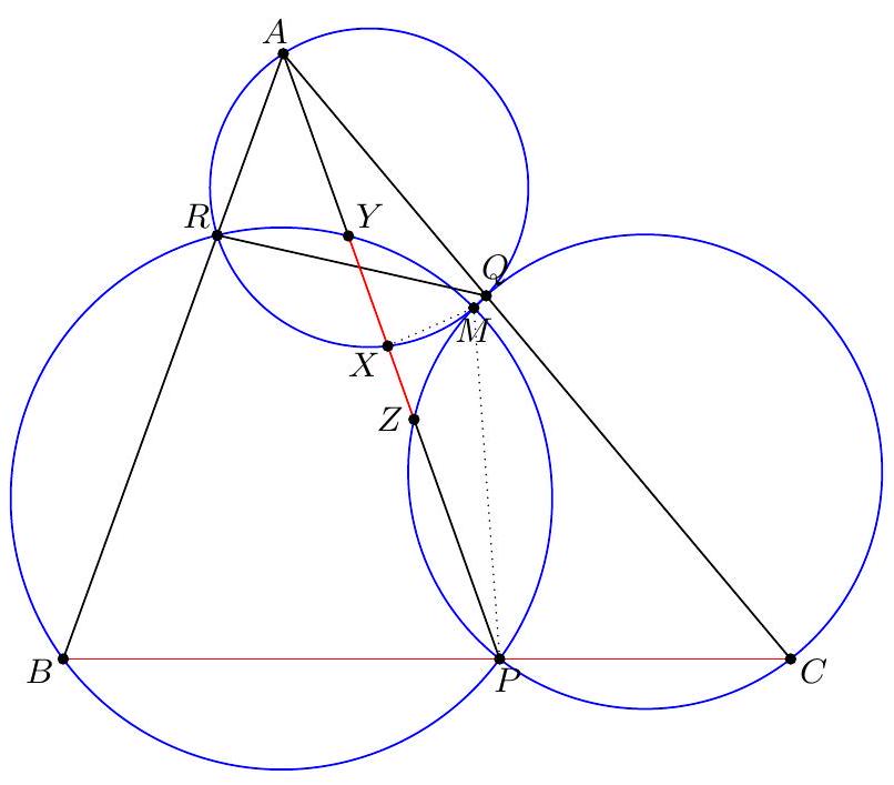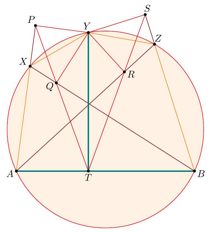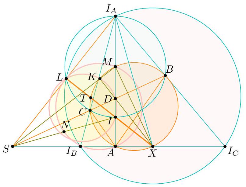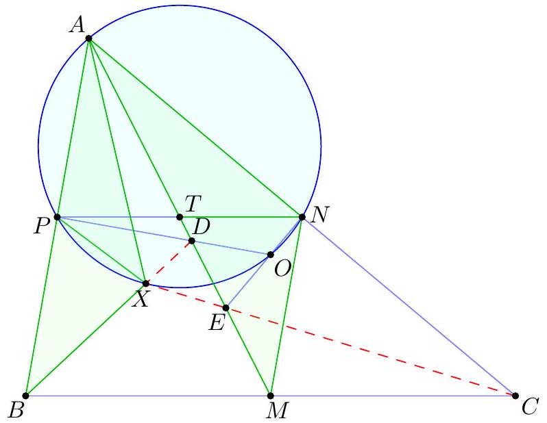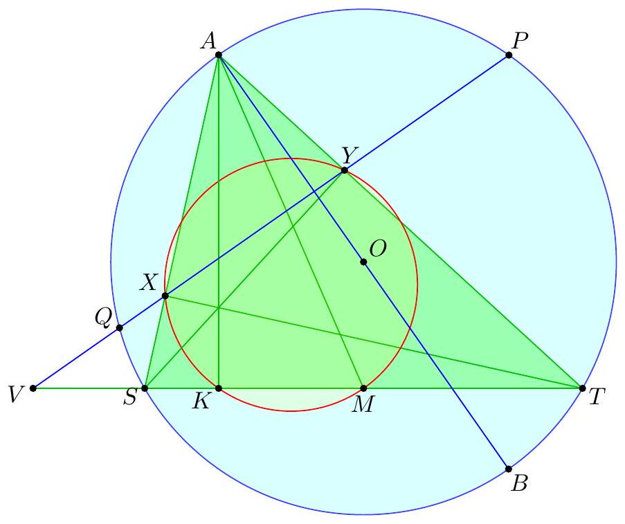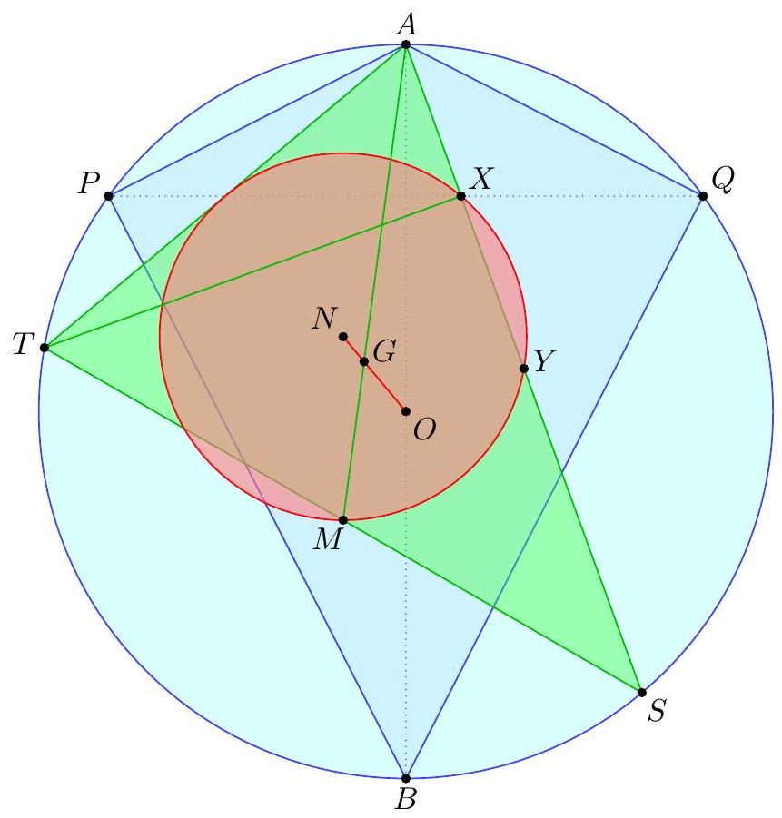 - $X$ at the midpoint of $\overline{P Q}$ (giving the midpoint of $\overline{B Q}$ ) which determines the circle; this circle then passes through $P$ by symmetry and we can find the center by taking the intersection of two perpendicular bisectors (which two?). γ Complex solution (Evan Chen). Toss on the complex unit circle with $a=-1, b=1$, $z=-\frac{1}{2}$. Let $s$ and $t$ be on the unit circle. We claim $Z$ is the center. It follows from standard formulas that $$ x=\frac{1}{2}(s+t-1+s / t) $$ thus $$ 4 \operatorname{Re} x+2=s+t+\frac{1}{s}+\frac{1}{t}+\frac{s}{t}+\frac{t}{s} $$ which depends only on $P$ and $Q$, and not on $X$. Thus $$ 4\left|z-\frac{s+t}{2}\right|^{2}=|s+t+1|^{2}=3+(4 \operatorname{Re} x+2) $$ does not depend on $X$, done.  Let $R$ denote the radius of $\omega$. Note that the nine-point circle of $\triangle A S T$ has radius equal to $\frac{1}{2} R$, and hence is independent of $S$ and $T$. Then the power of $A$ with respect to the nine-point circle equals $$ A N^{2}-\left(\frac{1}{2} R\right)^{2}=A X \cdot A Y=\frac{1}{2} A X \cdot A S=\frac{1}{2} A Q^{2} $$ and hence $$ A N^{2}=\left(\frac{1}{2} R\right)^{2}+\frac{1}{2} A Q^{2} $$ which does not depend on the choice of $X$. So $N$ moves along a circle centered at $A$. Since the points $O, G, N$ are collinear on the Euler line of $\triangle A S T$ with $$ G O=\frac{2}{3} N O $$ it follows by homothety that $G$ moves along a circle as well, whose center is situated one-third of the way from $A$ to $O$. Finally, since $A, G, M$ are collinear with $$ A M=\frac{3}{2} A G $$ it follows that $M$ moves along a circle centered at the midpoint of $\overline{A O}$.  The main claim is: Claim - Quadrilateral $P Q K M$ is cyclic. $$ V Q \cdot V P=V S \cdot V T=V X \cdot V Y=V K \cdot V M $$ using the nine-point circle, and the circle with diameter $\overline{S T}$. But the circumcenter of $P Q K M$, is the midpoint of $\overline{A O}$, since it lies on the perpendicular bisectors of $\overline{K M}$ and $\overline{P Q}$. So it is fixed, the end.