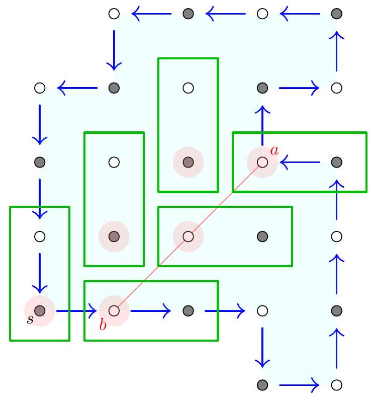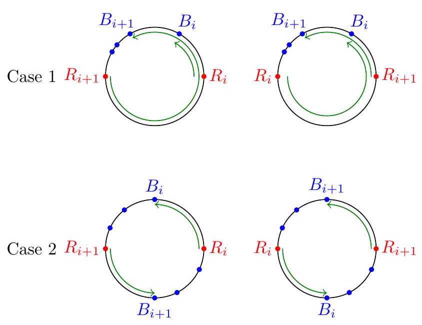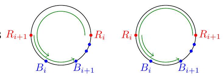 \ First "local" solution by swapping two points. Let $1 \leq i<n$ be any index and consider the two red points $R_{i}$ and $R_{i+1}$. There are two blue points $B_{i}$ and $B_{i+1}$ associated with them. Claim - If we swap the locations of points $R_{i}$ and $R_{i+1}$ then the new $\operatorname{arcs} R_{i} \rightarrow B_{i}$ and $R_{i+1} \rightarrow B_{i+1}$ will cover the same points. The two blue points can then be located in three possible ways: either 0,1 , or 2 of them lie on the $\operatorname{arc} R_{i} \rightarrow R_{i+1}$. For each of the cases below, we illustrate on the left the locations of $B_{i}$ and $B_{i+1}$ and the corresponding arcs in green; then on the right we show the modified picture where $R_{i}$ and $R_{i+1}$ have swapped. (Note that by hypothesis there are no other blue points in the green arcs).  Case $3 R_{i}$  Observe that in all cases, the number of arcs covering any given point on the circumference is not changed. Consequently, this proves the claim. Finally, it is enough to recall that any permutation of the red points can be achieved by swapping consecutive points (put another way: $(i i+1)$ generates the permutation group $S_{n}$ ). This solves the problem.