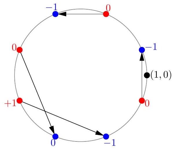 Let $P_{1}, P_{2}, \ldots, P_{2 n}$ be $2 n$ distinct points on the unit circle $x^{2}+y^{2}=1$, other than $(1,0)$. Each point is colored either red or blue, with exactly $n$ red points and $n$ blue points. Let $R_{1}, R_{2}, \ldots, R_{n}$ be any ordering of the red points. Let $B_{1}$ be the nearest blue point to $R_{1}$ traveling counterclockwise around the circle starting from $R_{1}$. Then let $B_{2}$ be the nearest of the remaining blue points to $R_{2}$ travelling counterclockwise around the circle from $R_{2}$, and so on, until we have labeled all of the blue points $B_{1}, \ldots, B_{n}$. Show that the number of counterclockwise arcs of the form $R_{i} \rightarrow B_{i}$ that contain the point $(1,0)$ is independent of the way we chose the ordering $R_{1}, \ldots, R_{n}$ of the red points.