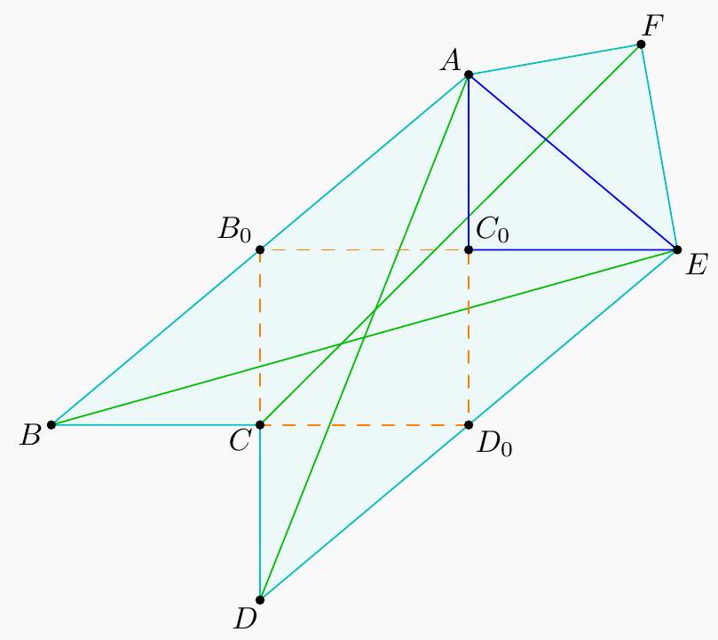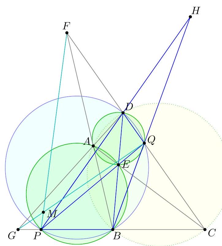 We present three general routes. (The second route, using the fact that $\overline{A C}$ is an angle bisector, has many possible variations.) γ Second solution (projective). We start with a synthetic observation. Claim - The line $\overline{A C}$ bisects $\angle P A D$ and $\angle B A Q$. There are three ways to finish from here: - (Michael Kural) Suppose the external bisector of $\angle P A D$ and $\angle B A Q$ meet lines $B C$ and $D C$ at $X$ and $Y$. Then $$ -1=(G P ; X C)=(F D ; Y C) $$ which is enough to imply that $\overline{X Y}, \overline{G Q}, \overline{P F}$ are concurrent (by so-called prism lemma). - (Daniel Liu) Alternatively, apply the dual Desargues involution theorem to complete quadrilateral GQFPCM, through the point $A$. This gives that an involutive pairing of $$ (A C, A M)(A P, A Q)(A G, A F) $$ This is easier to see if we project it onto the line $\ell$ through $C$ perpendicular to $\overline{A C}$; if we let $P^{\prime}, Q^{\prime}, G^{\prime}, F^{\prime}$ be the images of the last four lines, we find the involution coincides with negative inversion through $C$ with power $\sqrt{C P^{\prime} \cdot C Q^{\prime}}$ which implies that $\overline{A M} \cap \ell$ is an infinity point, as desired.