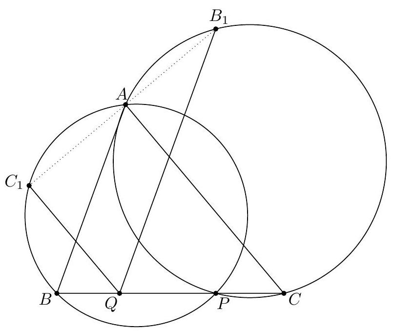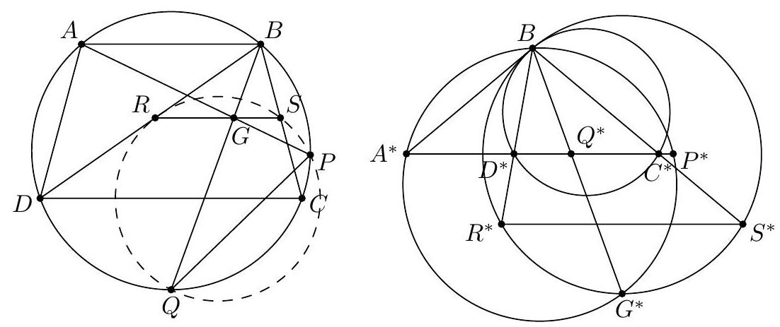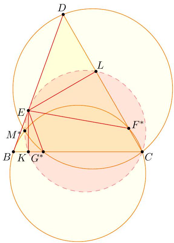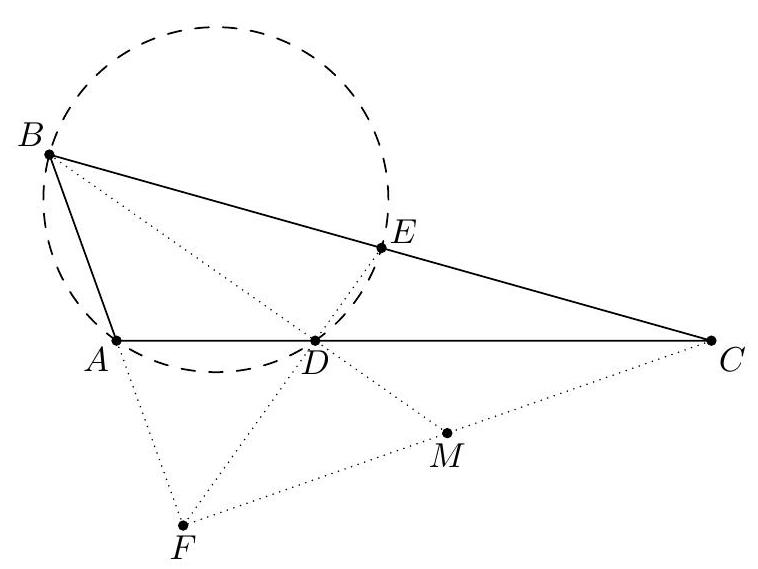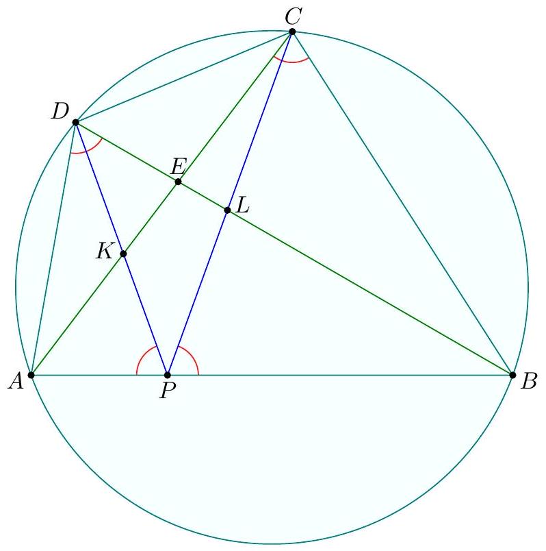 γ Second solution using only angle chasing (by proposer). We again re-define $P$ to obey $A D^{2}=A P \cdot A B$ and $B C^{2}=B P \cdot B A$. As before, this gives $\triangle A P D \sim \triangle A B D$ and $\triangle B P C \sim \triangle B D P$ and so we let $$ \theta:=\measuredangle D P A=\measuredangle A D B=\measuredangle A C B=\measuredangle B C P . $$ Our goal is to now show $\overline{P E}$ bisects $\overline{C D}$. Let $K=\overline{A C} \cap \overline{P D}$ and $L=\overline{A D} \cap \overline{P C}$. Since $\measuredangle K P A=\theta=\measuredangle A C B$, quadrilateral $B P K C$ is cyclic. Similarly, so is $A P L D$.  Finally $A K L B$ is cyclic since $$ \measuredangle B K A=\measuredangle B K C=\measuredangle B P C=\theta=\measuredangle D P A=\measuredangle D L A=\measuredangle B L A . $$ This implies $\measuredangle C K L=\measuredangle L B A=\measuredangle D C K$, so $\overline{K L} \| \overline{B C}$. Then $P E$ bisects $\overline{B C}$ by Ceva's theorem on $\triangle P C D$.
