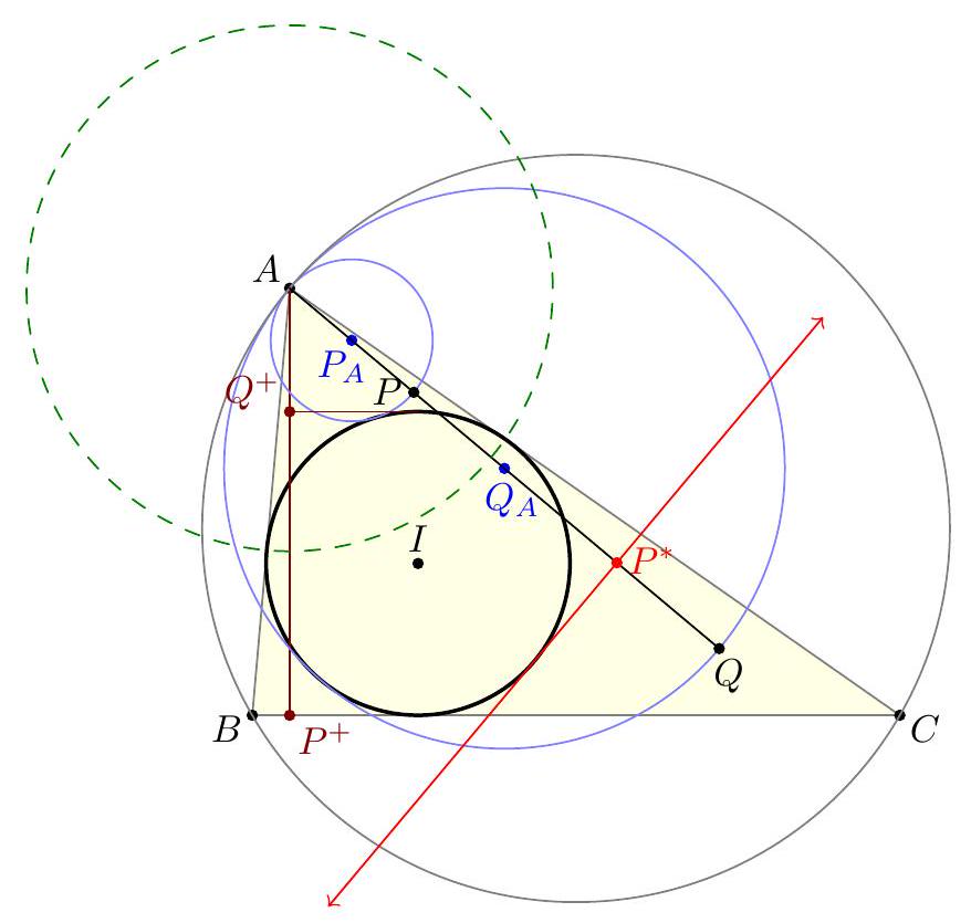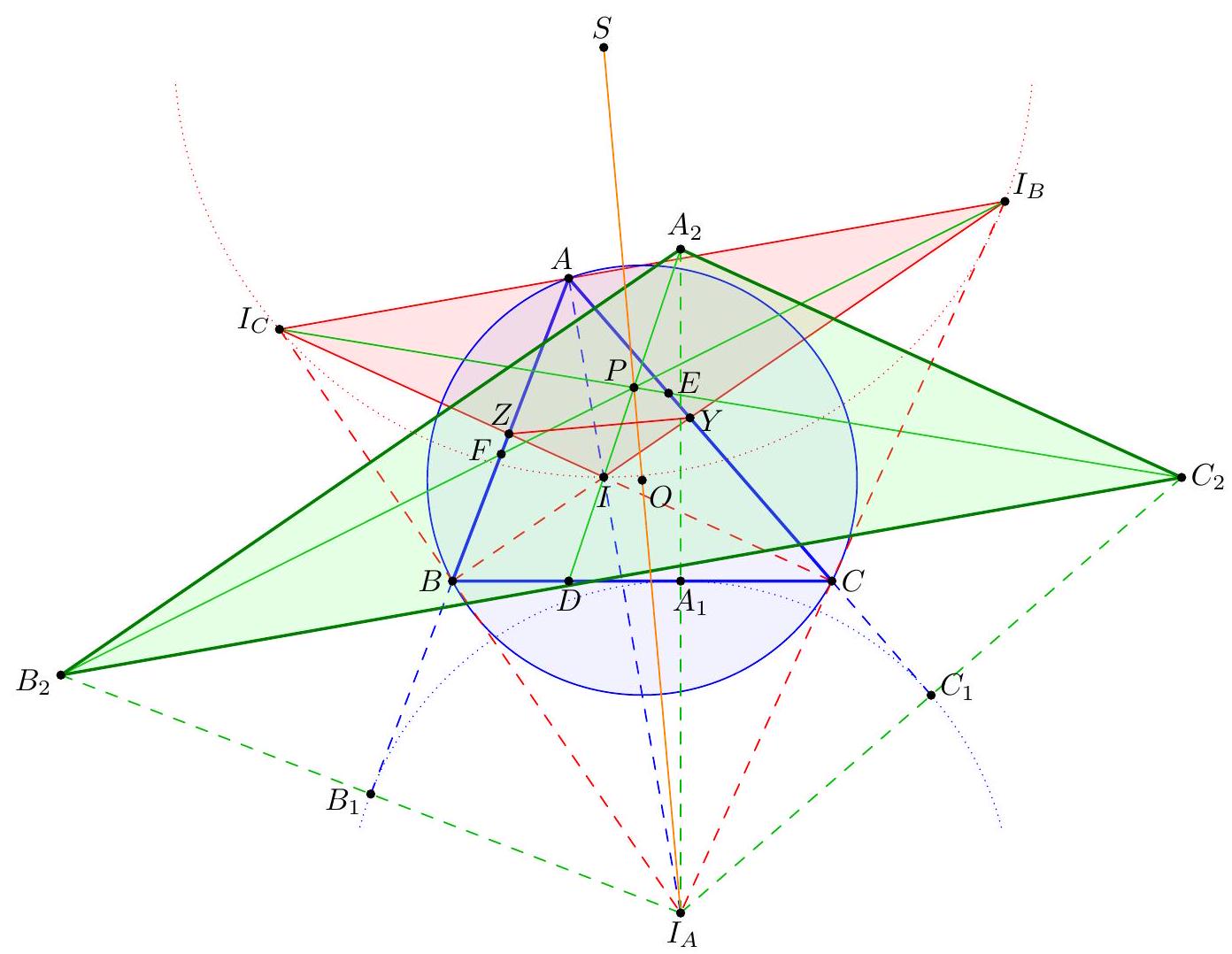 I Second solution (barycentric, outline, Colin Tang). we are going to use barycentric coordinates to show that the line through $O$ perpendicular to $\overline{Y Z}$ is concurrent with $\overline{I_{B} F}$ and $\overline{I_{C} E}$. The displacement vector $\overrightarrow{Y Z}$ is proportional to $(a(b-c):-b(a+c): c(a+b))$, and so by strong perpendicularity criterion and doing a calculation gives the line $$ x(b-c) b c(a+b+c)+y(a+c) a c(a+b-c)+z(a+b) a b(-a+b-c)=0 . $$ On the other hand, line $I_{C} E$ has equation $$ 0=\operatorname{det}\left[\begin{array}{ccc} a & b & -c \\ S_{C} & 0 & S_{A} \\ x & y & z \end{array}\right]=b S_{a} \cdot x+\left(-c S_{C}-a S_{A}\right) \cdot y+\left(-b S_{C}\right) \cdot z $$ and similarly for $I_{B} F$. Consequently, concurrence of these lines is equivalent to $$ \operatorname{det}\left[\begin{array}{ccc} b S_{A} & -c S_{C}-a S_{A} & -b S_{C} \\ c S_{A} & -c S_{B} & -a S_{A}-b S_{B} \\ (b-c) b c(a+b+c) & (a+c) a c(a+b-c) & (a+b) a b(-a+b-c) \end{array}\right]=0 $$ which is a computation. \ Authorship comments. I was intrigued by a Taiwan TST problem which implied that, in the configuration above, $\angle I_{B} D I_{C}$ was bisected by $\overline{D A}$. This motivated me to draw all three properties above where $I_{A}$ and $P$ were isogonal conjugates with respect to $D E F$. After playing around with this picture for a long time, I finally noticed that $O$ was on line $P I_{A}$. (So the original was to show that $I_{B} F, I_{C} E, D A_{2}$ concurrent). Eventually I finally noticed in the picture that $P I_{A}$ actually passed through the circumcenter of $A B C$ as well. This took me many hours to prove. The final restatement (which follows quickly from $P, O, I_{A}$ collinear) was discovered by Telv Cohl when I showed him the problem.