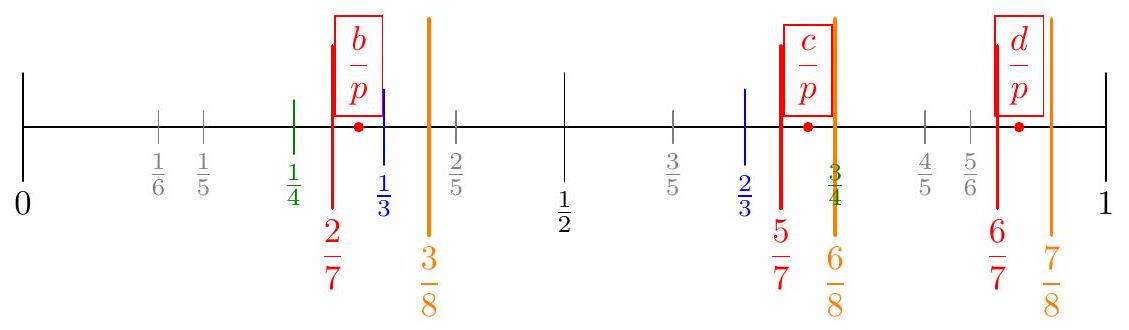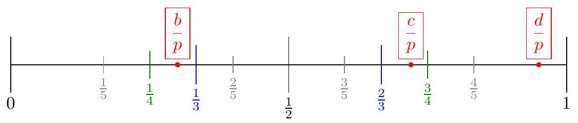 First of all, we apparently have $r(a+b+c+d) \equiv 0(\bmod p)$ for every prime $p$, so it automatically follows that $a+b+c+d \equiv 0(\bmod p)$. By scaling appropriately, and also replacing each number with its remainder modulo $p$, we are going to assume that $$ 1=a \leq b \leq c \leq d<p $$ We are going to prove that $d=p-1$, which will solve the problem. Claim - For each integer $r=1,2, \ldots, p-1$ we have $$ 2(r-1)=\left\lfloor\frac{r b}{p}\right\rfloor+\left\lfloor\frac{r c}{p}\right\rfloor+\left\lfloor\frac{r d}{p}\right\rfloor . $$ $$ 2=\sum_{\mathrm{cyc}}\left(\frac{r a}{p}-\left\lfloor\frac{r a}{p}\right\rfloor\right) $$ and since $a+b+c+d=2 p$ the conclusion follows.  In symbols, it will be enough to prove the following. Claim - For each $r=1,2, \ldots, p-2$ we have $\frac{r-1}{r}<\frac{d}{p}<1$. Equivalently, for each $r=1,2, \ldots, p-2$ we have $\left\lfloor\frac{r b}{p}\right\rfloor+\left\lfloor\frac{r c}{p}\right\rfloor=r-1$. $$ r-1>\left\lfloor\frac{r d}{p}\right\rfloor \geq\left\lfloor\frac{(r-1) d}{p}\right\rfloor=r-2 $$ Now, we have that $$ 2(r-1)=\left\lfloor\frac{r b}{p}\right\rfloor+\left\lfloor\frac{r c}{p}\right\rfloor+\underbrace{\left\lfloor\frac{r d}{p}\right\rfloor}_{=r-2} . $$ Thus $\left\lfloor\frac{r b}{p}\right\rfloor>\left\lfloor\frac{(r-1) b}{p}\right\rfloor$, and $\left\lfloor\frac{r c}{p}\right\rfloor>\left\lfloor\frac{(r-1) b}{p}\right\rfloor$. An example of this situation is illustrated below with $r=7$ (not to scale).  Right now, $\frac{b}{p}$ and $\frac{c}{p}$ are just to the right of $\frac{u}{r}$ and $\frac{v}{r}$ for some $u$ and $v$ with $u+v=r$. The issue is that the there is some fraction just to the right of $\frac{b}{p}$ and $\frac{c}{p}$ from an earlier value of $r$, and by hypothesis its denominator is going to be strictly greater than 1 . It is at this point we are going to use the properties of Farey sequences. When we consider the fractions with denominator $r+1$, they are going to lie outside of the interval they we have constrained $\frac{b}{p}$ and $\frac{c}{p}$ to lie in. Indeed, our minimality assumption on $r$ guarantees that there is no fraction with denominator less than $r$ between $\frac{u}{r}$ and $\frac{b}{p}$. So if $\frac{u}{r}<\frac{b}{p}<\frac{s}{t}$ (where $\frac{u}{r}$ and $\frac{s}{t}$ are the closest fractions with denominator at most $r$ to $\frac{b}{p}$ ) then Farey theory says the next fraction inside the interval $\left[\frac{u}{r}, \frac{s}{t}\right]$ is $\frac{u+s}{r+t}$, and since $t>1$, we have $r+t>r+1$. In other words, we get an inequality of the form $$ \frac{u}{r}<\frac{b}{p}<\underbrace{\text { something }}_{=s / t} \leq \frac{u+1}{r+1} . $$ The same holds for $\frac{c}{p}$ as $$ \frac{v}{r}<\frac{c}{p}<\text { something } \leq \frac{v+1}{r+1} $$ Finally, $$ \frac{d}{p}<\frac{r-1}{r}<\frac{r}{r+1} $$ So now we have that $$ \left\lfloor\frac{(r+1) b}{p}\right\rfloor+\left\lfloor\frac{(r+1) c}{p}\right\rfloor+\left\lfloor\frac{(r+1) d}{p}\right\rfloor \leq u+v+(r-1)=2 r-1 $$ which is a contradiction. Now, since $$ \frac{p-3}{p-2}<\frac{d}{p} \Longrightarrow d>\frac{p(p-3)}{p-2}=p-1-\frac{2}{p-2} $$ which for $p>2$ gives $d=p-1$.