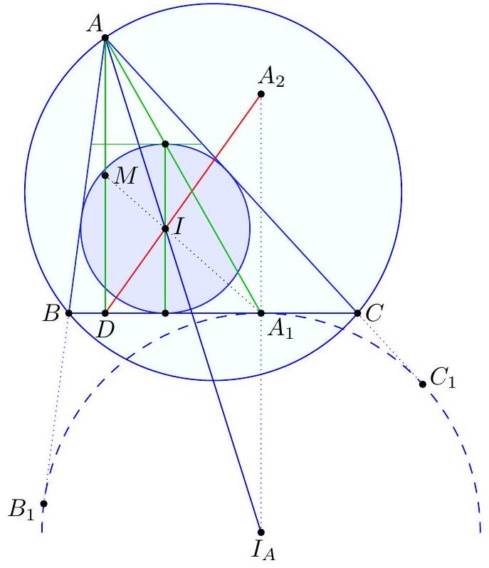 Let $W$ be the midpoint of $\overline{B C}$, let $X$ be the point on $\Omega$ opposite $M$. Observe that $\overline{K D}$ passes through $X$, and thus lines $B C, M K, X A$ concur at the orthocenter of $\triangle D M X$, which we call $S$. Denote by $I_{A}$ the $A$-excenter of $A B C$. Next, let $E$ be the foot of the altitude from $I$ to $\overline{X I_{A}}$; observe that $E$ lies on the circle centered at $M$ through $I, B, C, I_{A}$. Then, $S$ is the radical center of $\Omega$ and the circles with diameter $\overline{I X}$ and $\overline{I I_{A}}$; hence line $S I$ passes through $E$; accordingly $I$ is the orthocenter of $\triangle X S I_{A}$; denote by $L$ the foot from $X$ to $\overline{S I_{A}}$.  We claim that this $L$ lies on both the circumcircle of $\triangle K I D$ and $\triangle M A N$. It lies on the circumcircle of $\triangle M A N$ since this circle is the nine-point circle of $\triangle X S I_{A}$. Also, $X D \cdot X K=X W \cdot X M=X A \cdot X S=X I \cdot X L$, so $K D I L$ are concyclic. All that remains to show is that the midpoint $T$ of $\overline{I L}$ lies on $\Omega$. But this follows from the fact that $\overline{T M} \| \overline{L I_{A}} \Longrightarrow \angle M T X=90^{\circ}$, thus the problem is solved. Remark. Some additional facts about this picture: the point $T$ is the contact point of the $A$-mixtilinear incircle (since it is collinear with $X$ and $I$ ), while the point $K$ is such that $\overline{A K}$ is an $A$-symmedian (since $\overline{K D}$ and $\overline{A D}$ bisect $\angle A$ and $\angle K$, say).  Remark. In fact, the point $L$ is the Miquel point of cyclic quadrilateral $I_{B} I_{C} B C$ (inscribed in the circle with diameter $\overline{I_{B} I_{C}}$ ). This implies many of the properties that $L$ has above. For example, it directly implies that $L$ lies on the circumcircles of triangles $I_{A} I_{B} I_{C}$ and $B C I_{A}$, and that the point $L$ lies on $\overline{S I_{A}}$ (since $S=\overline{B C} \cap \overline{I_{B} I_{C}}$ ). For this reason, many students found it easier to think about the problem in terms of $\triangle I_{A} I_{B} I_{C}$ rather than $\triangle A B C$.