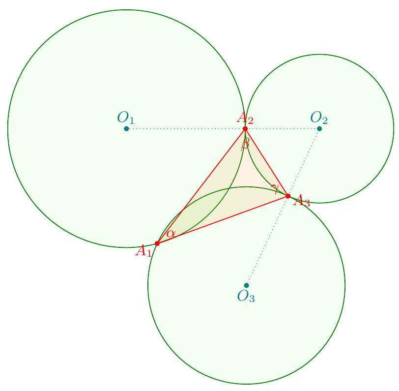 The idea is to keep track of the subtended arc $\widehat{A_{i} A_{i+1}}$ of $\omega_{i}$ for each $i$. To this end, let $\beta=\measuredangle A_{1} A_{2} A_{3}, \gamma=\measuredangle A_{2} A_{3} A_{1}$ and $\alpha=\measuredangle A_{1} A_{2} A_{3}$.  Initially, we set $\theta=\measuredangle O_{1} A_{2} A_{1}$. Then we compute $$ \begin{aligned} & \measuredangle O_{1} A_{2} A_{1}=\theta \\ & \measuredangle O_{2} A_{3} A_{2}=-\beta-\theta \\ & \measuredangle O_{3} A_{1} A_{3}=\beta-\gamma+\theta \\ & \measuredangle O_{4} A_{2} A_{1}=(\gamma-\beta-\alpha)-\theta \end{aligned} $$ and repeating the same calculation another round gives $$ \measuredangle O_{7} A_{2} A_{1}=k-(k-\theta)=\theta $$ with $k=\gamma-\beta-\alpha$. This implies $O_{7}=O_{1}$, so $\omega_{7}=\omega_{1}$.