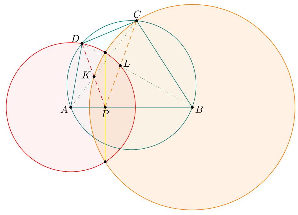 γ Third solution (using inversion). By hypothesis, the circle $\omega_{a}$ centered at $A$ with radius $A D$ is orthogonal to the circle $\omega_{b}$ centered at $B$ with radius $B C$. For brevity, we let $\mathbf{I}_{a}$ and $\mathbf{I}_{b}$ denote inversion with respect to $\omega_{a}$ and $\omega_{b}$. We let $P$ denote the intersection of $\overline{A B}$ with the radical axis of $\omega_{a}$ and $\omega_{b}$; hence $P=\mathbf{I}_{a}(B)=\mathbf{I}_{b}(A)$. This already implies that $$ \measuredangle D P A \stackrel{\mathbf{I}_{a}}{=} \measuredangle A D B=\measuredangle A C B \stackrel{\mathbf{I}_{b}}{=} \measuredangle B P C $$ so $P$ satisfies the angle condition.  Claim - The point $K=\mathbf{I}_{a}(C)$ lies on $\omega_{b}$ and $\overline{D P}$. Similarly $L=\mathbf{I}_{b}(D)$ lies on $\omega_{a}$ and $\overline{C P}$. Finally, since $C, L, P$ are collinear, we get $A$ is concyclic with $K=\mathbf{I}_{a}(C), L=\mathbf{I}_{a}(L)$, $B=\mathbf{I}_{a}(P)$, i.e. that $A K L B$ is cyclic. So $\overline{K L} \| \overline{C D}$ by Reim's theorem, and hence $\overline{P E}$ bisects $\overline{C D}$ by Ceva's theorem.