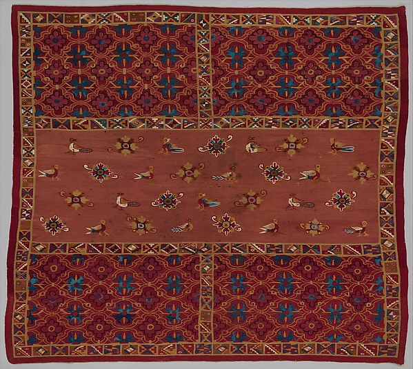 "https://images.metmuseum.org/CR... | null | The American Wing | Upholstery panel | Seat cover | Peruvian | late 17th–early 18th century (?) | 1,685 | 1,715 | Tapestry weave, cotton warp and camelid hair, silver gilt, and silk weft | 20 3/4 x 19 1/2 in. (52.5 x 49.5 cm.) | [