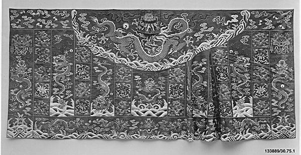 68,519 | false | 30.75.17 | 1930 | true | [] | null | Asian Art | Robe, Imperial Court | Imperial Court Robe | China | Qing dynasty (1644–1911), Jiaqing period (1796–1820) | 19th century | 1,800 | 1,820 | Silk, metallic thread | 53 1/2 x 48 in. (135.89 x 121.92 cm) | [