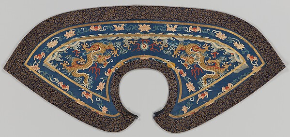 ] | null | Asian Art | Collar | Formal Collar | China | Qing dynasty (1644–1911) | 18th century | 1,700 | 1,799 | Silk and metallic-thread tapestry (kesi) with painted details, embroidered with metallic thread | Overall: 13 1/2 x 30 1/4 in. (34.3 x 76.8 cm) | [