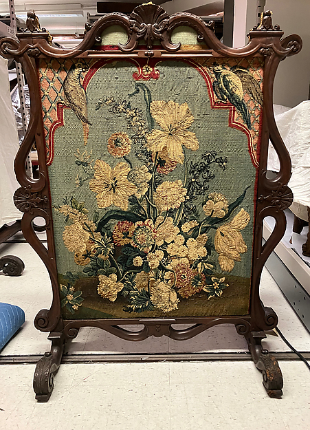 ] | European Sculpture and Decorative Arts | Fire screen | Fire screen | Factory | Tapestry woven at | Beauvais | Beauvais | https://www.wikidata.org/wiki/Q2566130 | http://vocab.getty.edu/page/ulan/500110803 | late 17th–early 18th century | 1,685 | 1,715 | Carved walnut, wool and silk tapestry panel | 42 3/4 × 32 1/4 in. (108.6 × 81.9 cm) | [
