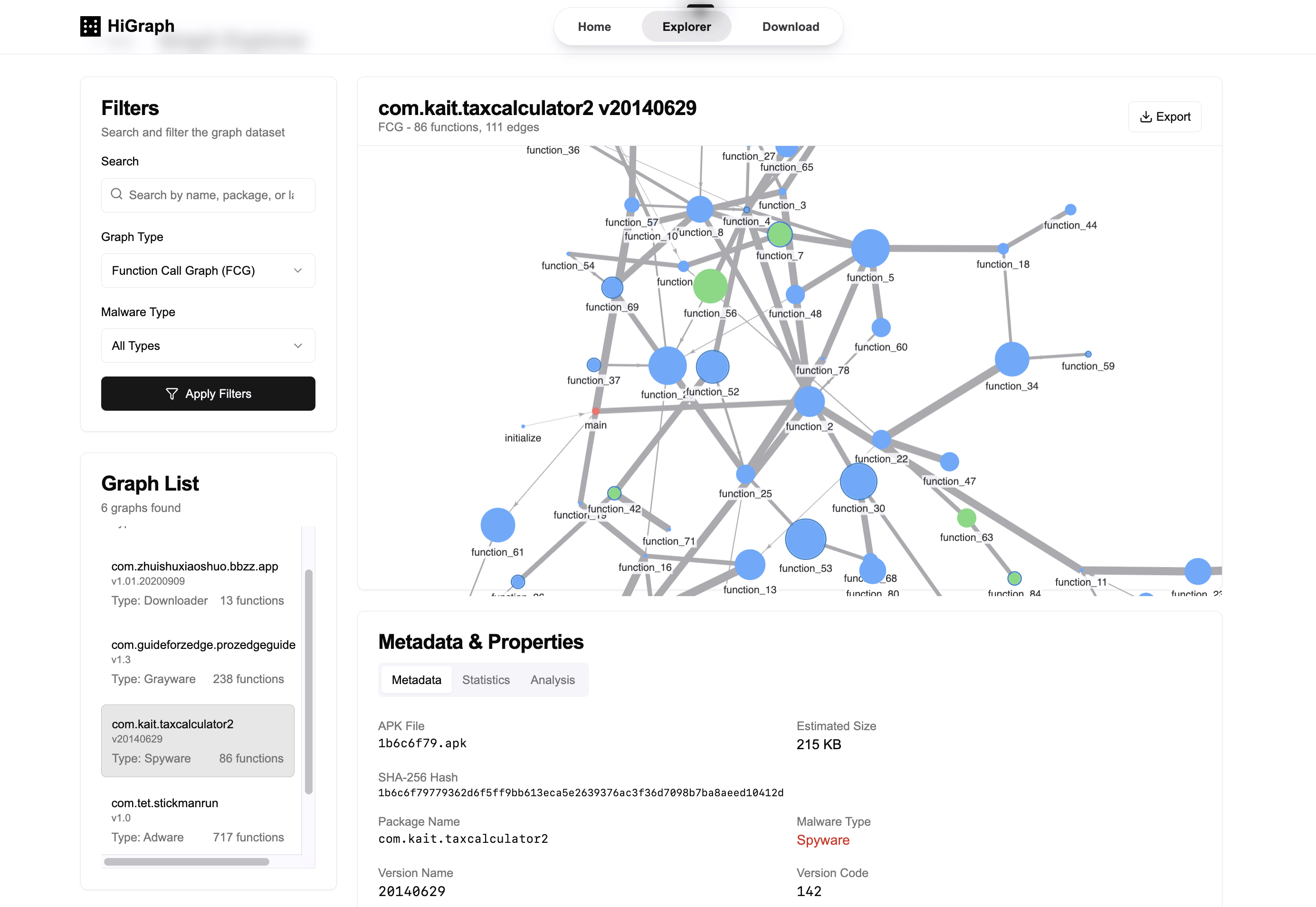 HiGraph is a novel, large-scale dataset that models each application as a hierarchical graph: a local Control Flow Graph (CFG) capturing intra-function logic and a global Function Call Graph (FCG) capturing inter-function interactions.